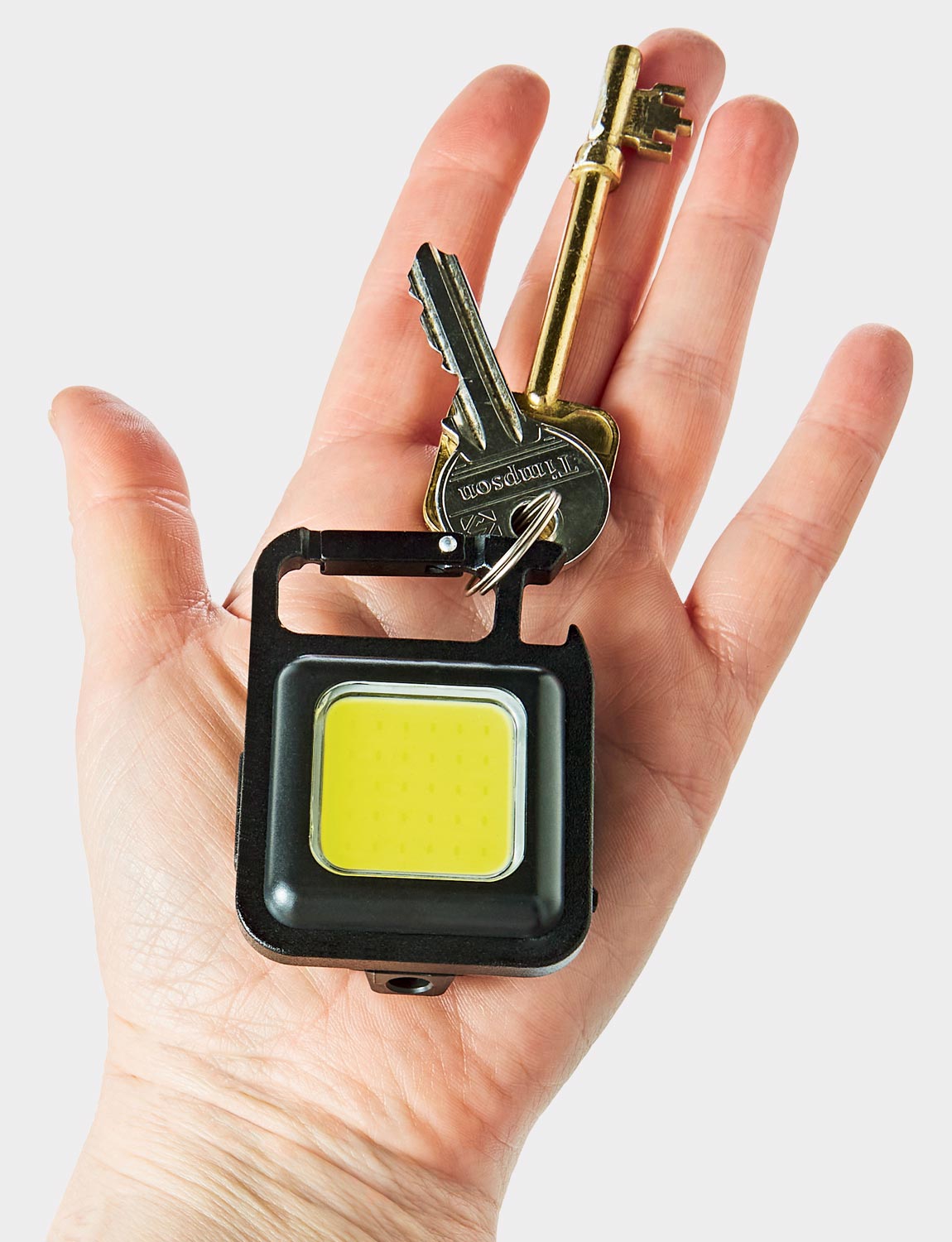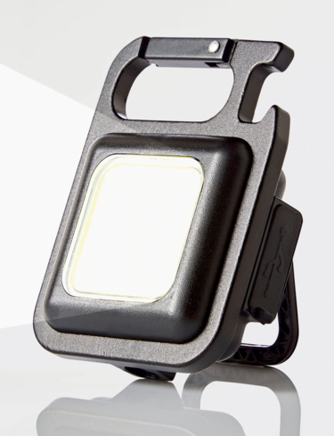 Hang on your keyring or use freestanding with the integrated stand. Complete with the latest COB technology, 3 light modes, rechargeable battery and USB charger.