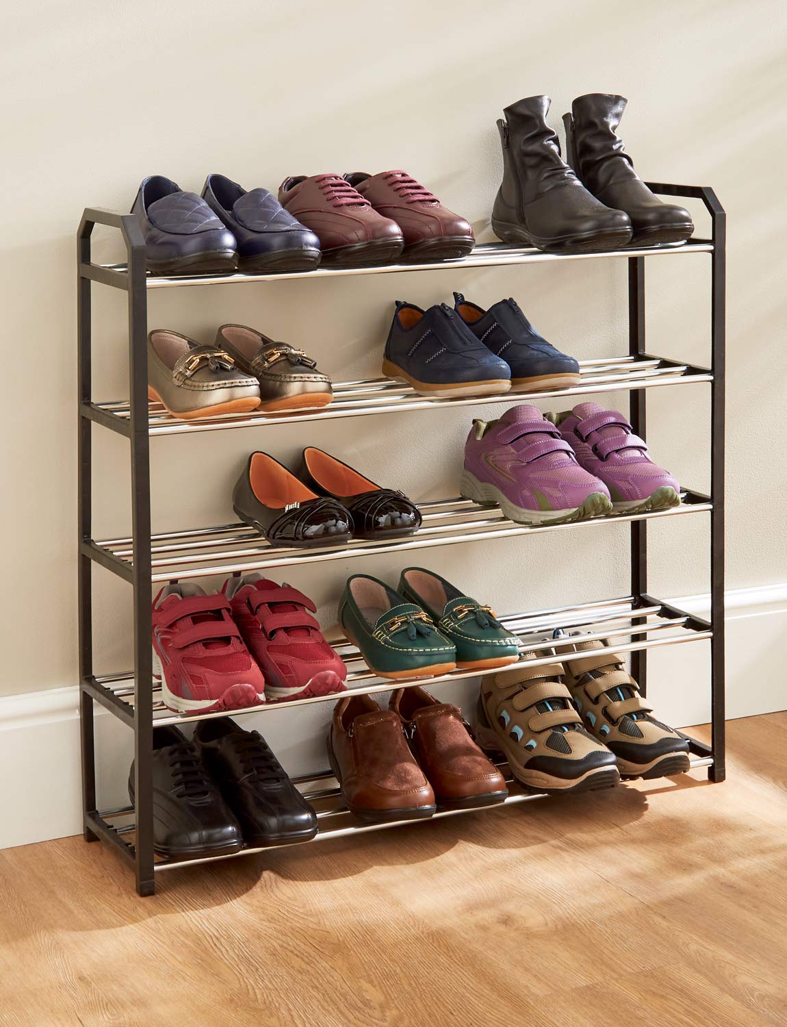 Free standing with a metal frame and chrome effect shelves. Push fit assembly. Holds up to 20 pairs.