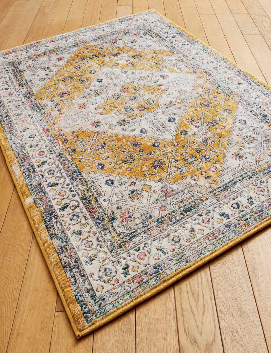 Delightful traditional style rug in a stylish gold diamond pattern. Surface shampoo.