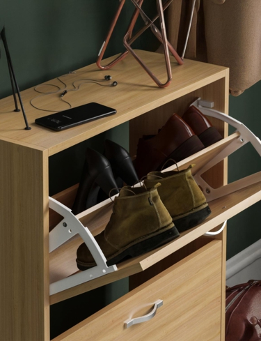 Neatly fitting into your hallway – this Slim-line Shoe Store keeps all your footwear neat and tidy. Space for up to 6 pairs per drawer. Simple home assembly.
