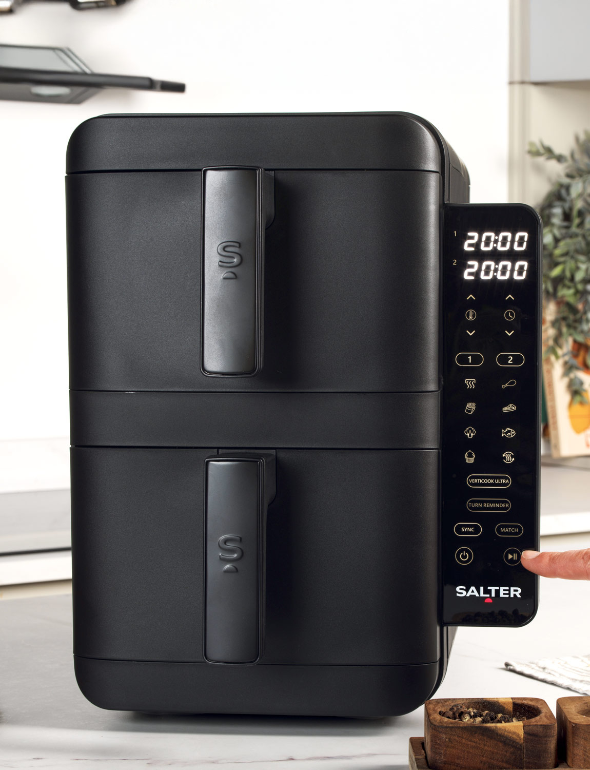 Designed to maximise counter top space, this incredible dual drawer air fryer features a pop-out control panel, 9 pre-set meal options and twin drawers with 2 stainless steel cooking racks to double up on cooking. Save up to 58% on your energy bills.