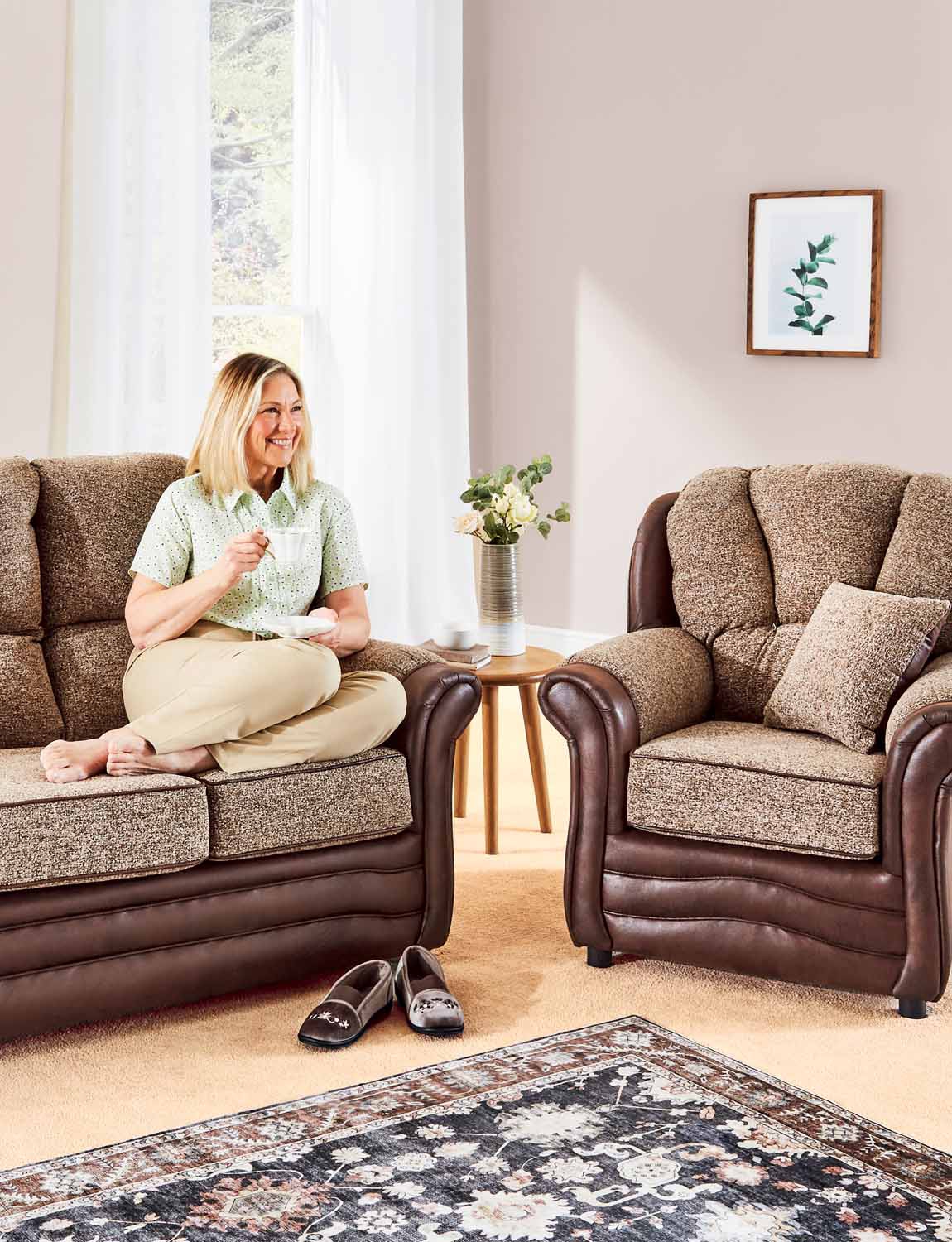 Attractive new Carlton 2 + 1 Suite – specially designed with soft and warm fabric cushions and roll-over arms contrasting exquisitely with deliciously smart leather effect back and front panels and piped cushions. Specially designed with more compact dimensions and beautifully made in the heart of the country by a crack team of craftsmen this gorgeous new suite is made to last with a solid wood frame, covered with the latest high quality hardwearing jacquard fabrics and matching FREE scatter cushions. Made just for you for your order.