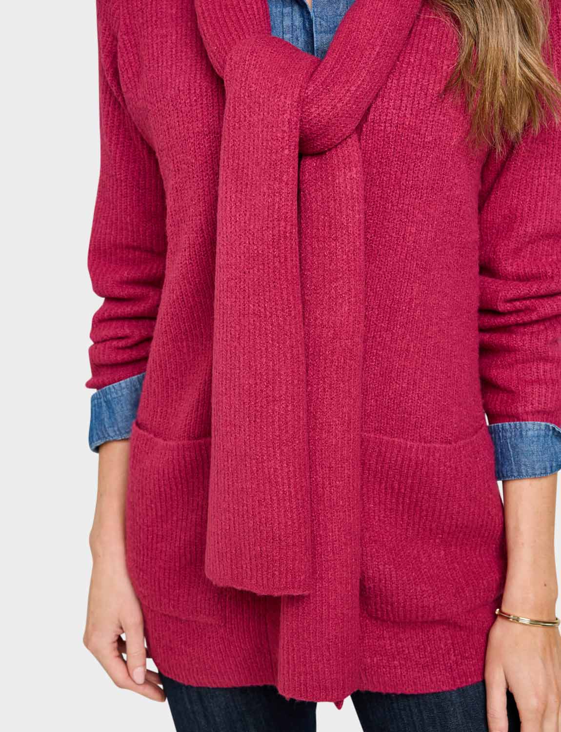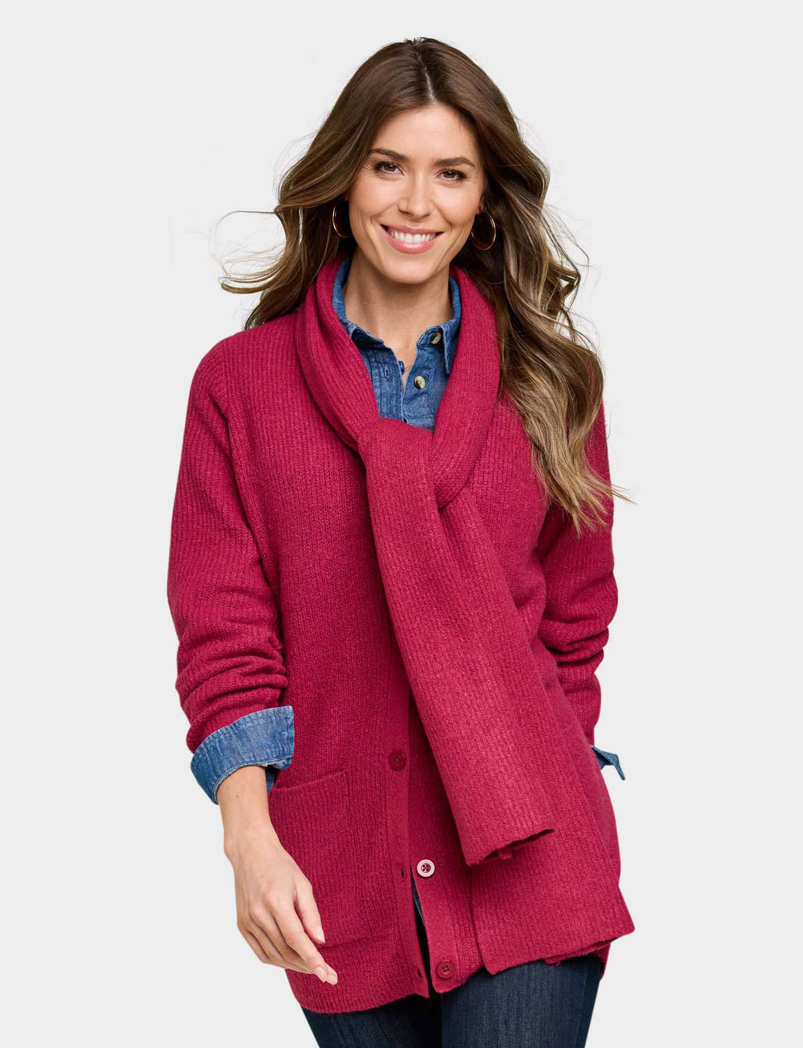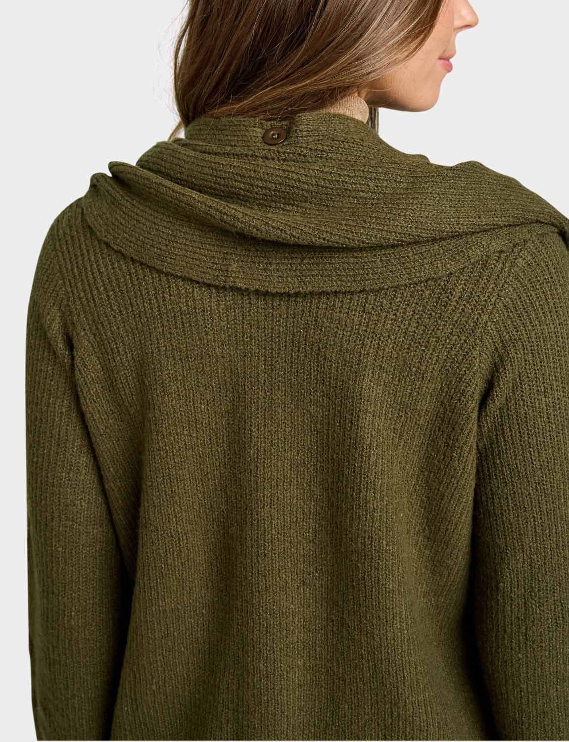 Long sleeve button fastening v-neck cardigan in a rib knit wool look yarn with back back neck button off detachable scarf and 2 front pockets.