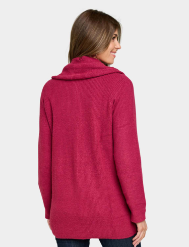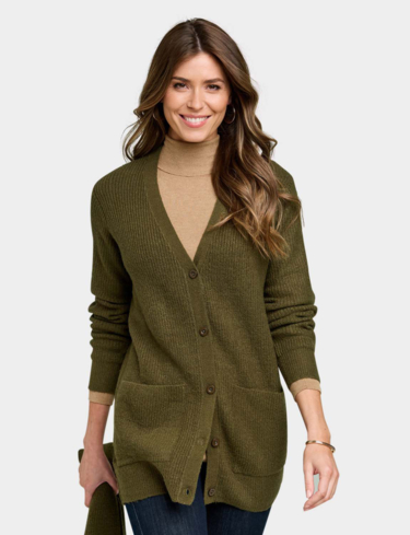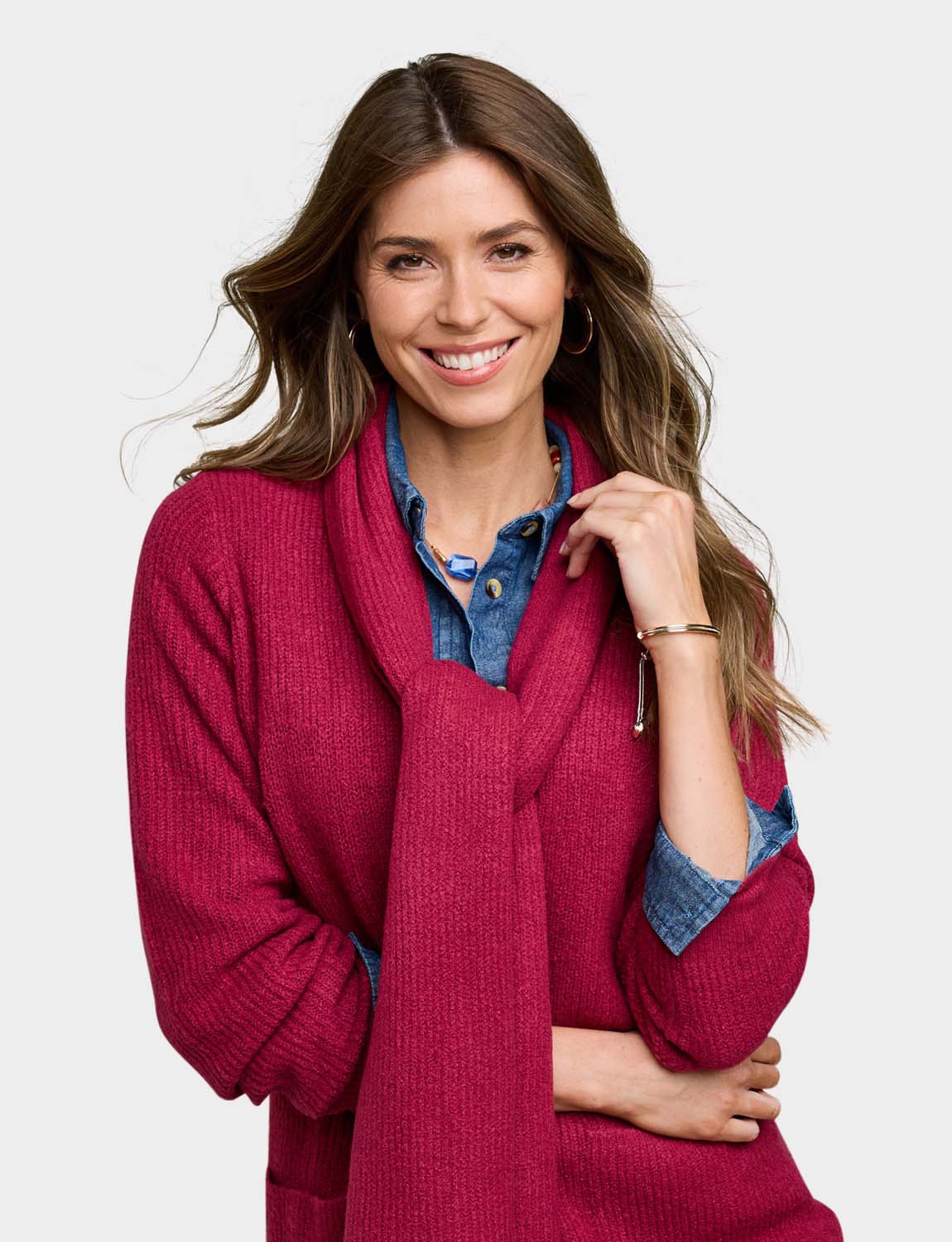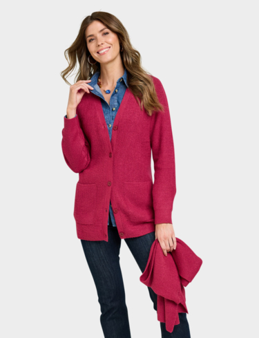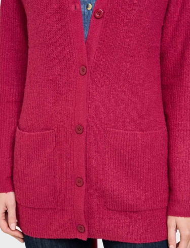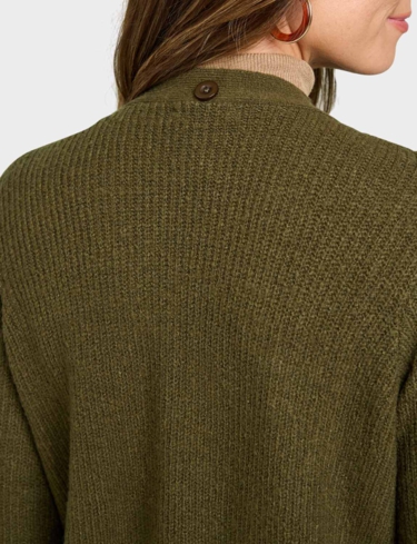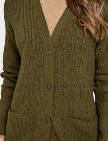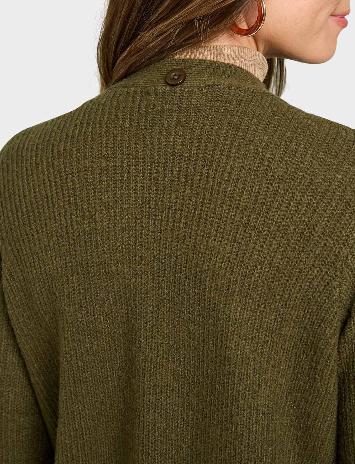 Long sleeve button fastening v-neck cardigan in a rib knit wool look yarn with back back neck button off detachable scarf and 2 front pockets.