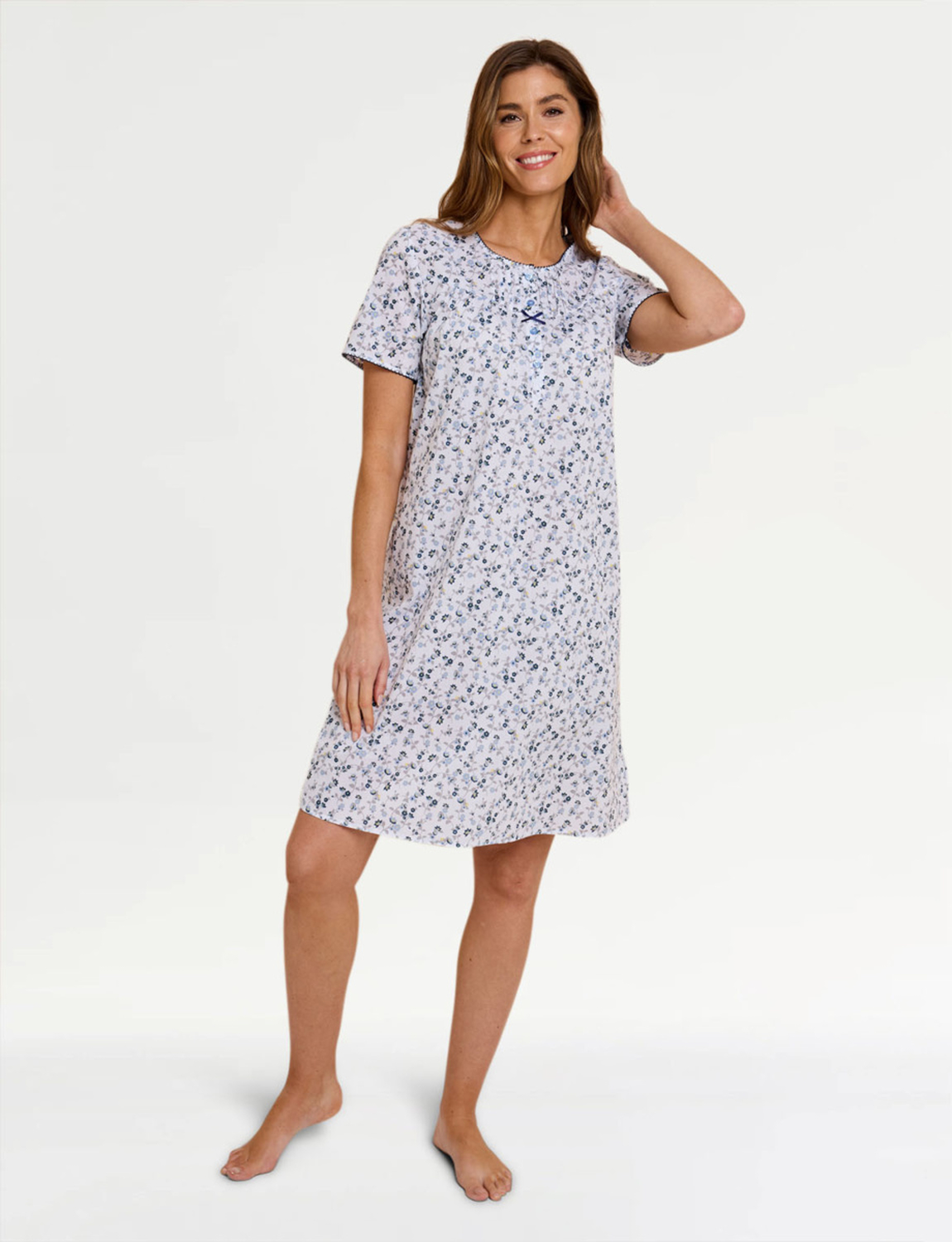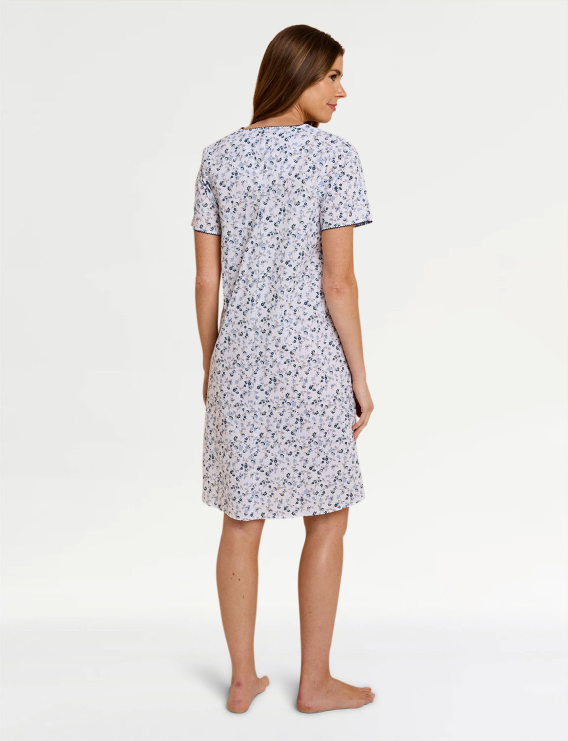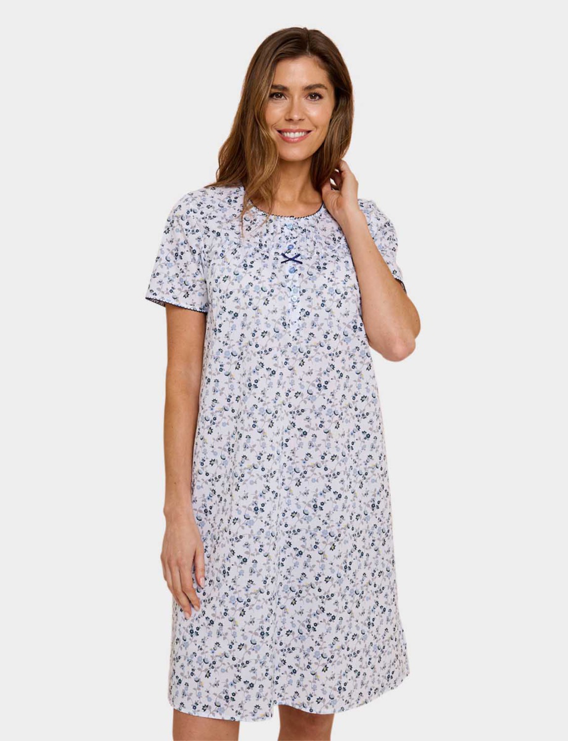 Ditsy floral print short sleeve woven fabric nightdress with button front placket.