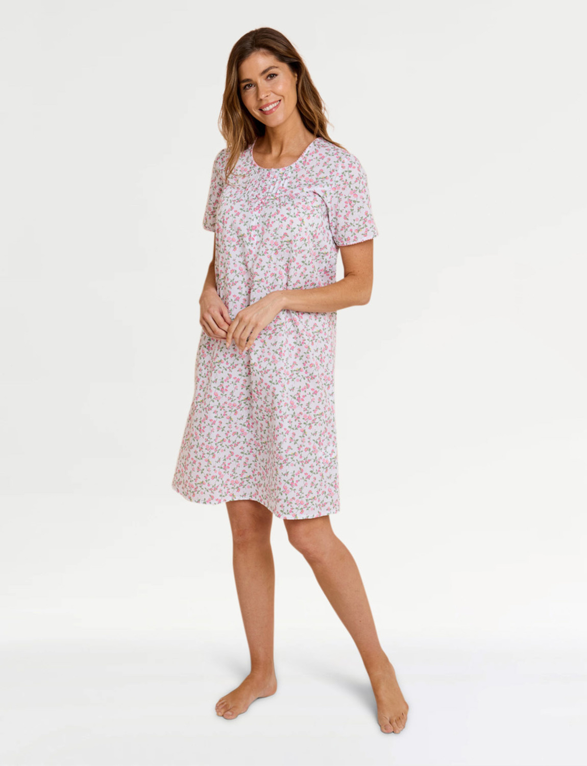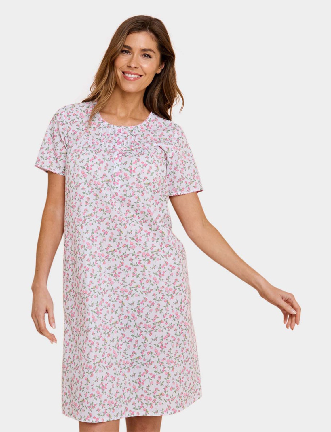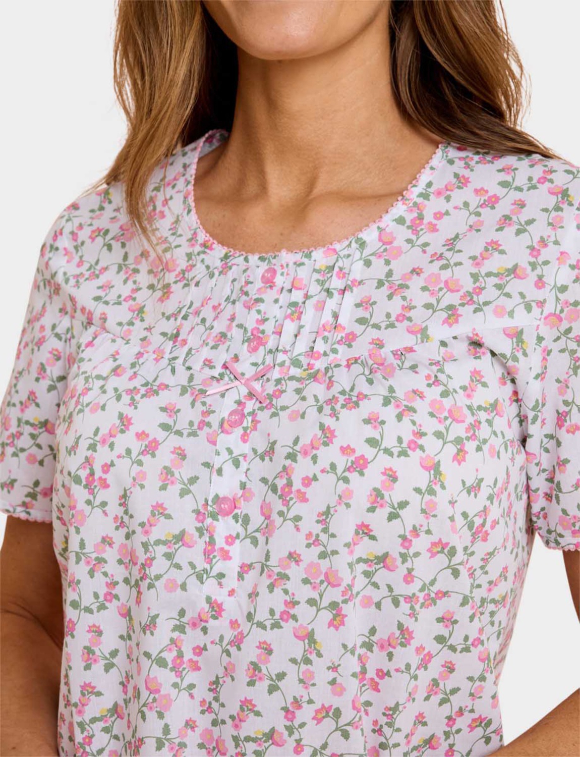 Ditsy floral print short sleeve woven fabric nightdress with button front placket.