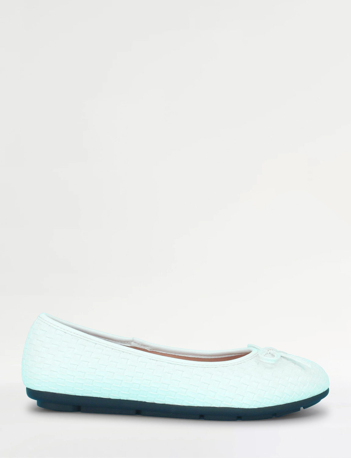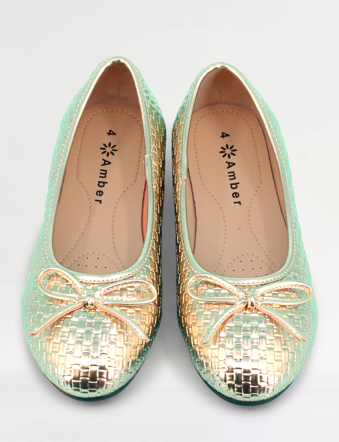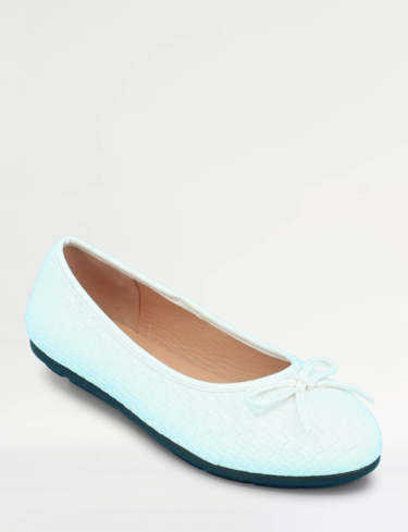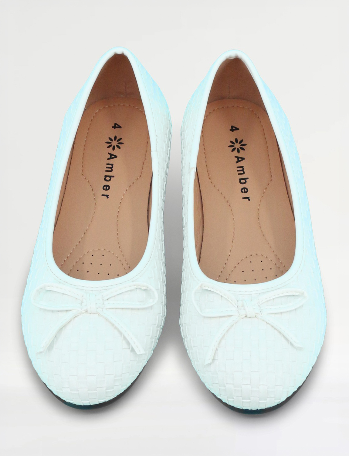 Ballerina style shoe with padded insole for comfort , basket weave effect upper and attractive bow detail.