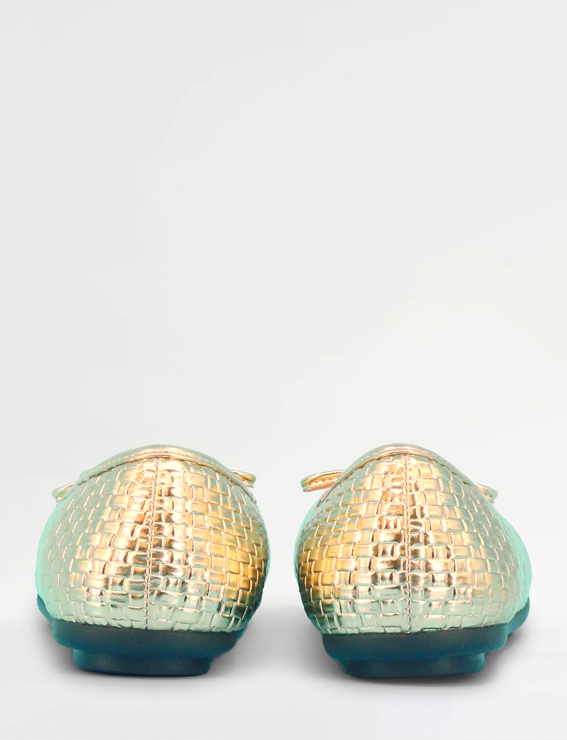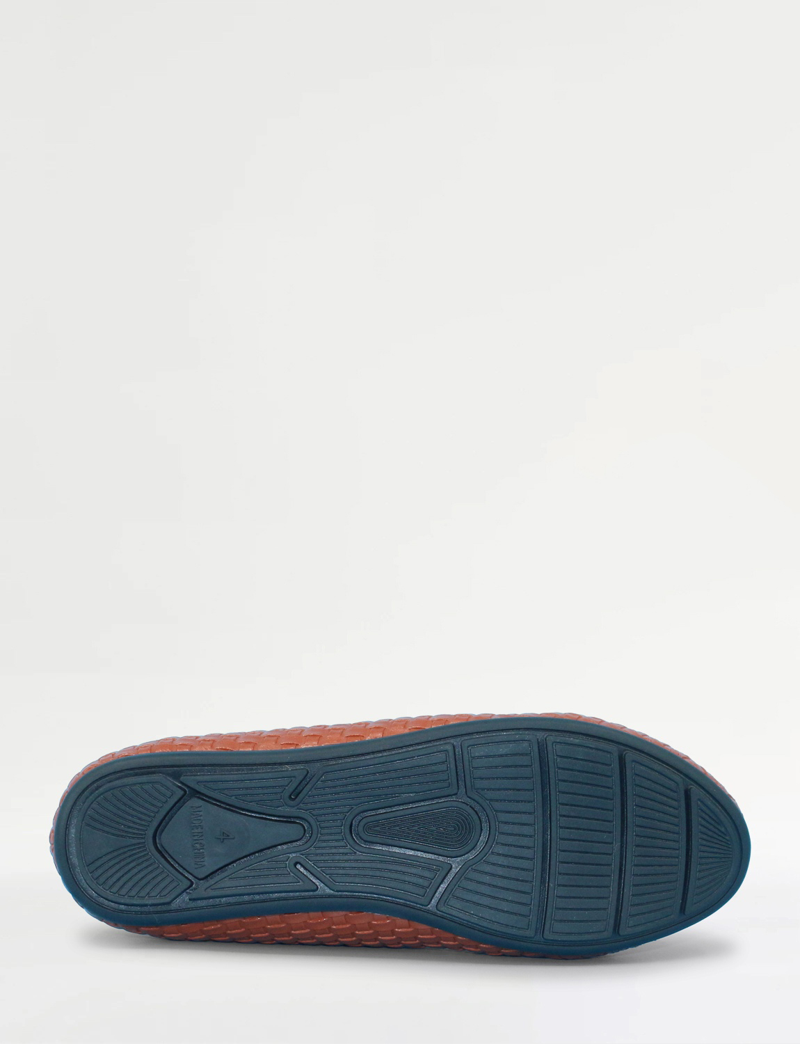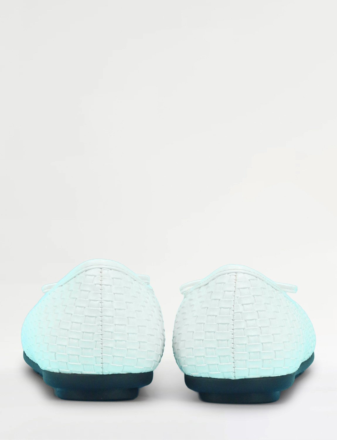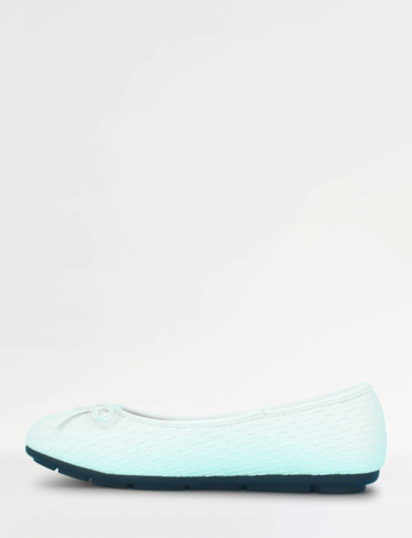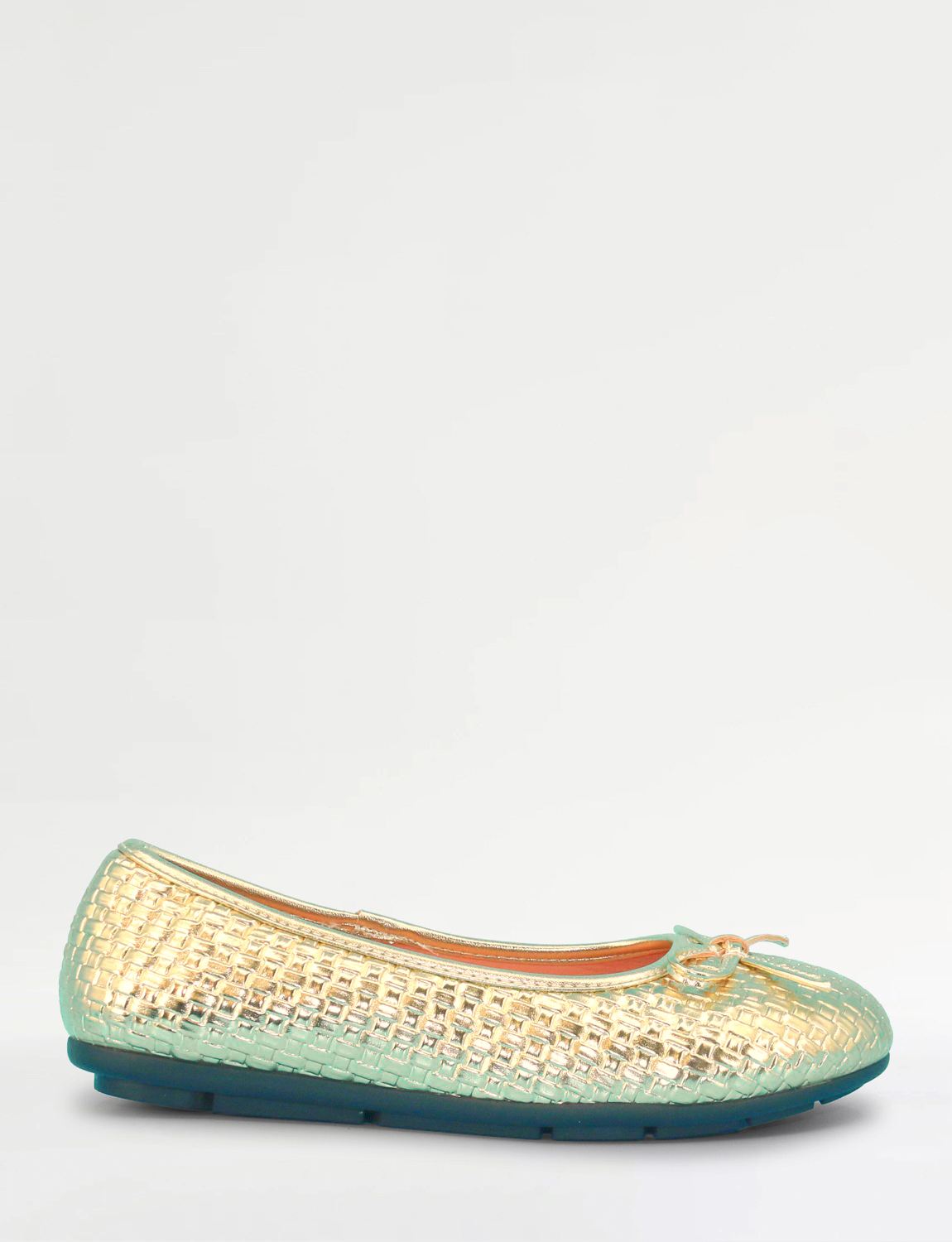 Ballerina style shoe with padded insole for comfort , basket weave effect upper and attractive bow detail.