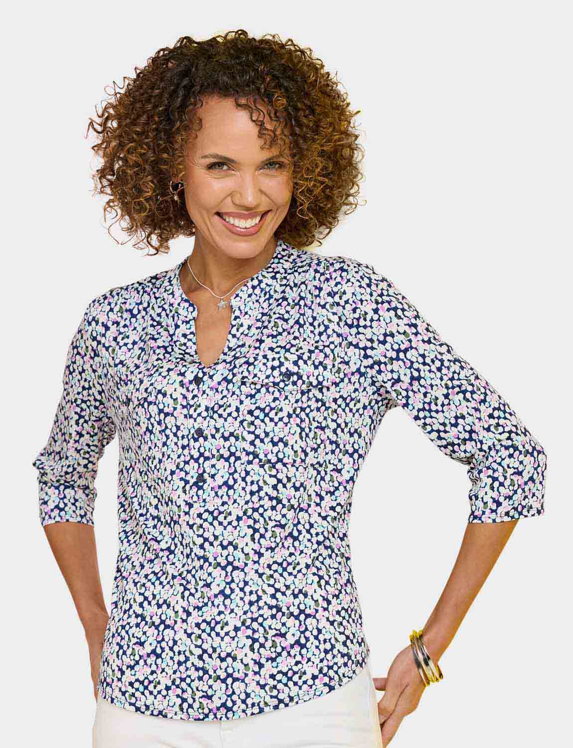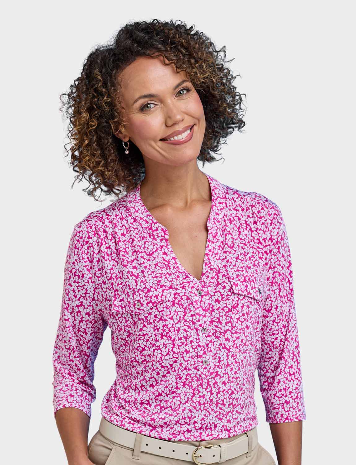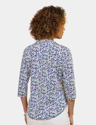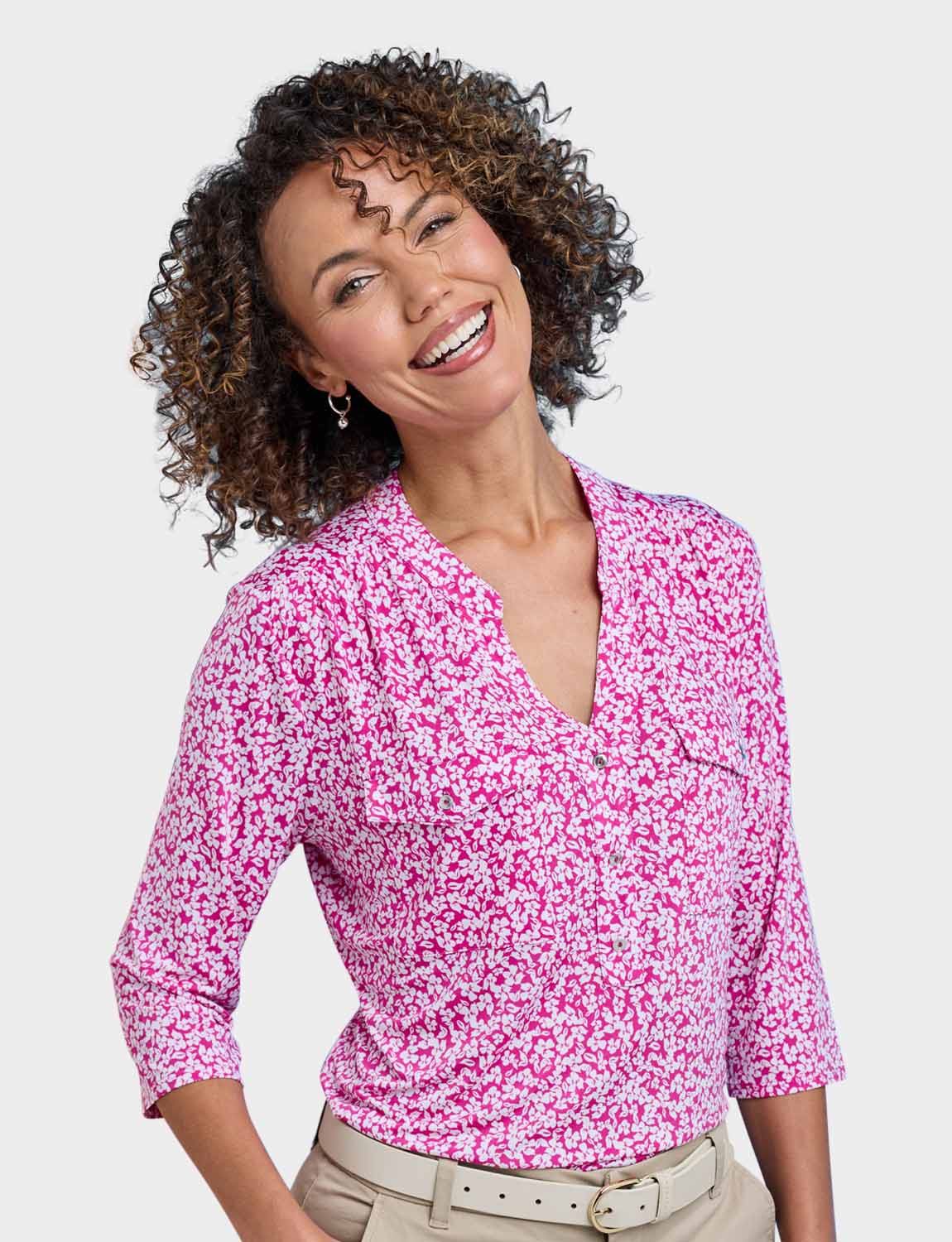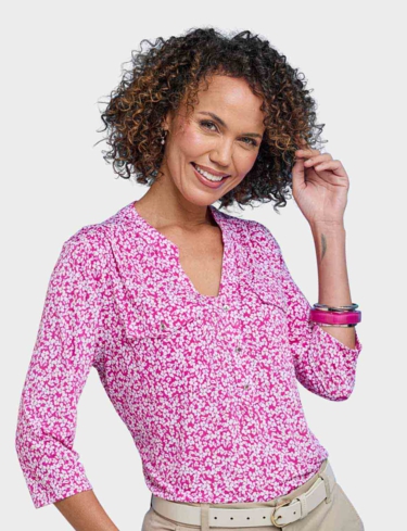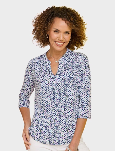 In soft handle brushed jersey fabric with three quarter sleeves, 3 button placket to front and 2 front patch pockets.