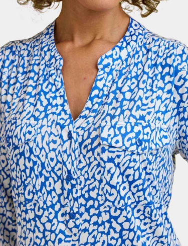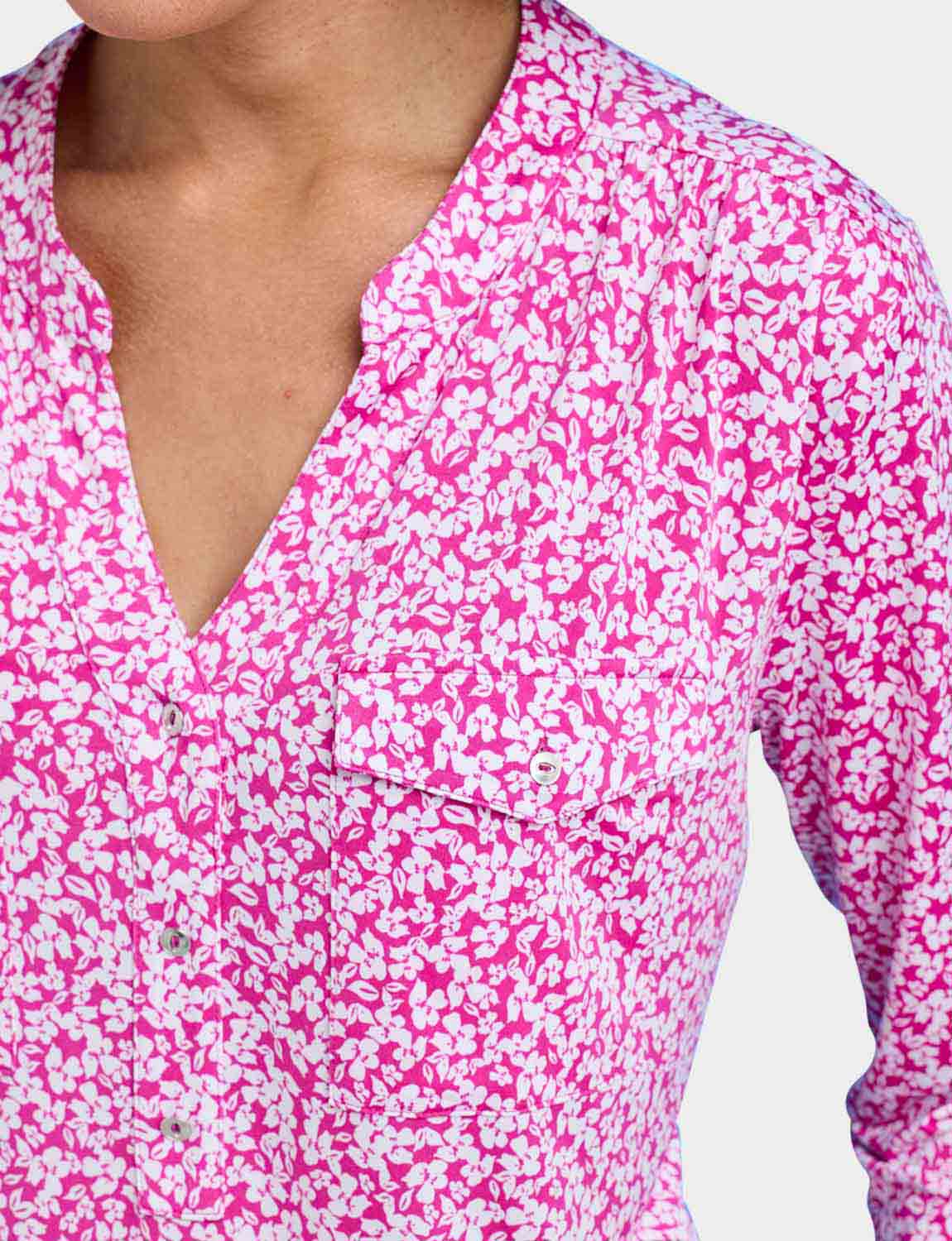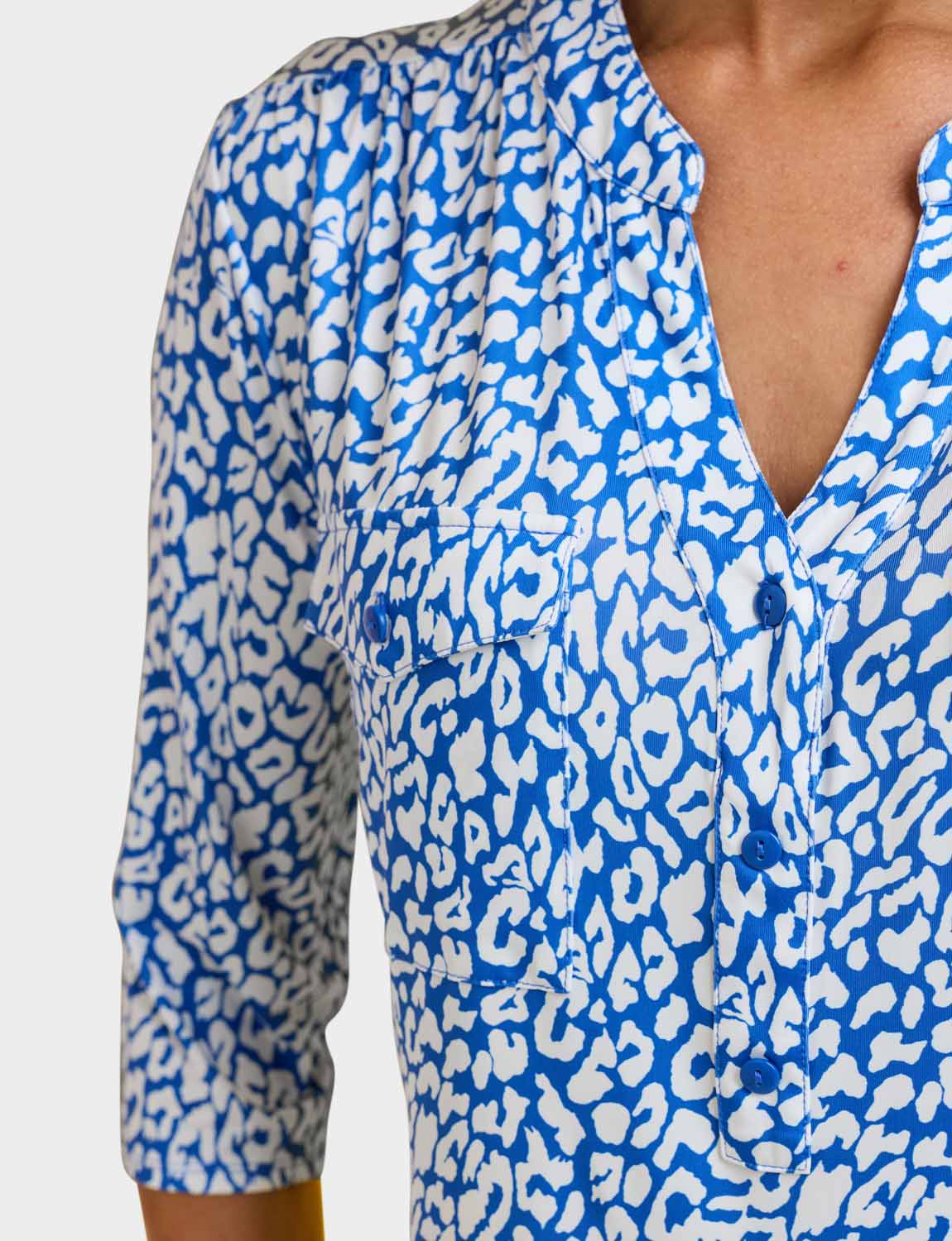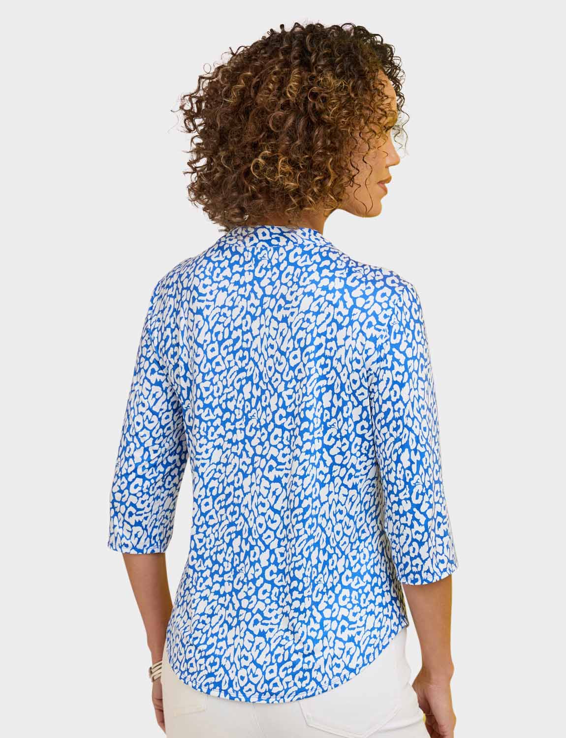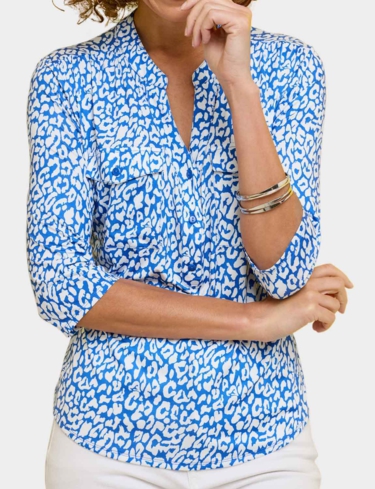 In soft handle brushed jersey fabric with three quarter sleeves, 3 button placket to front and 2 front patch pockets.