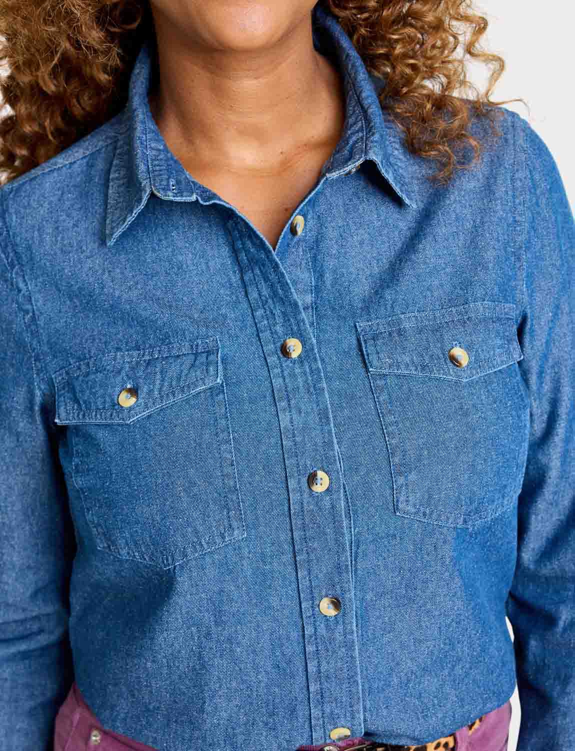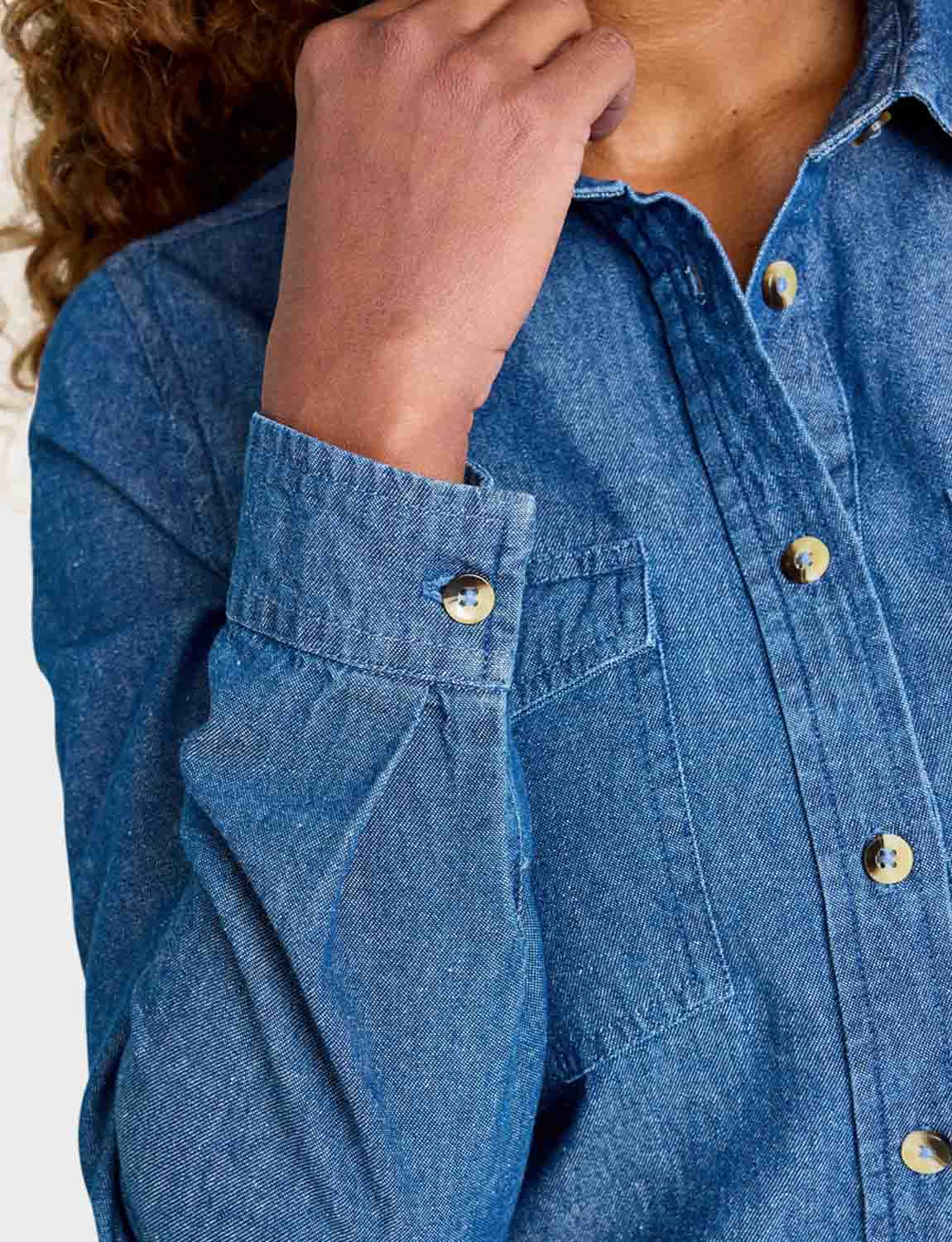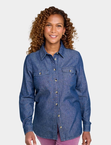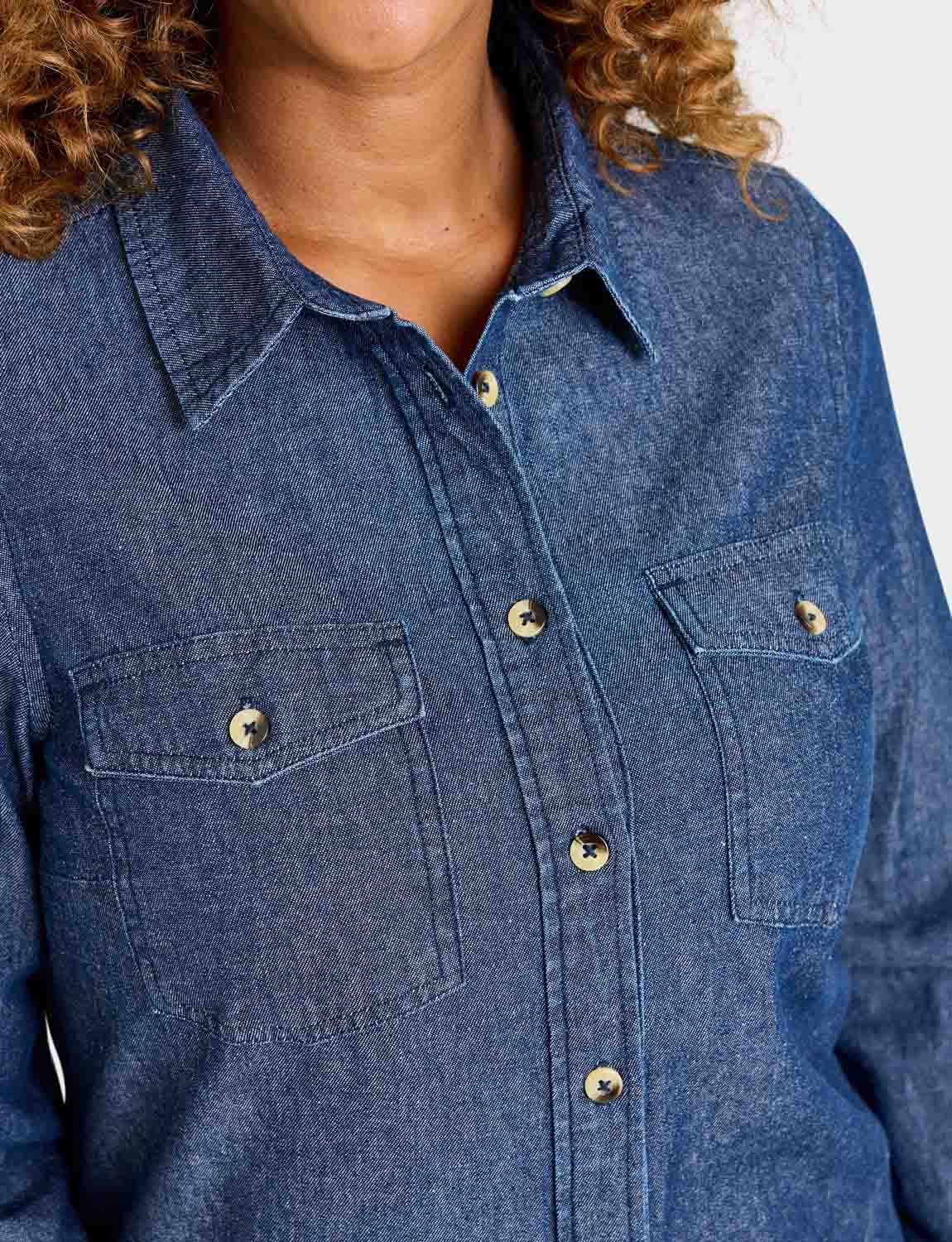 Long sleeve button front lightweight denim shirt with 2 chest pockets.
