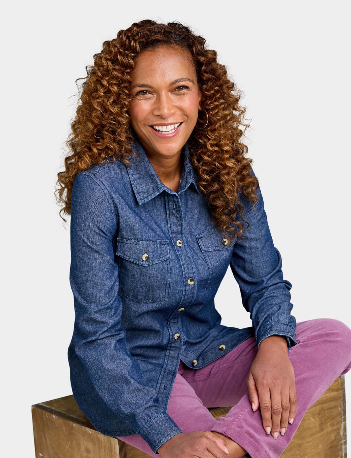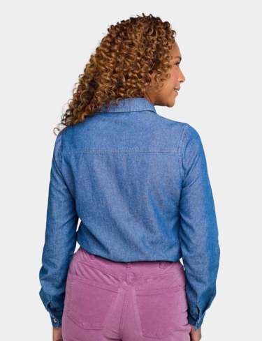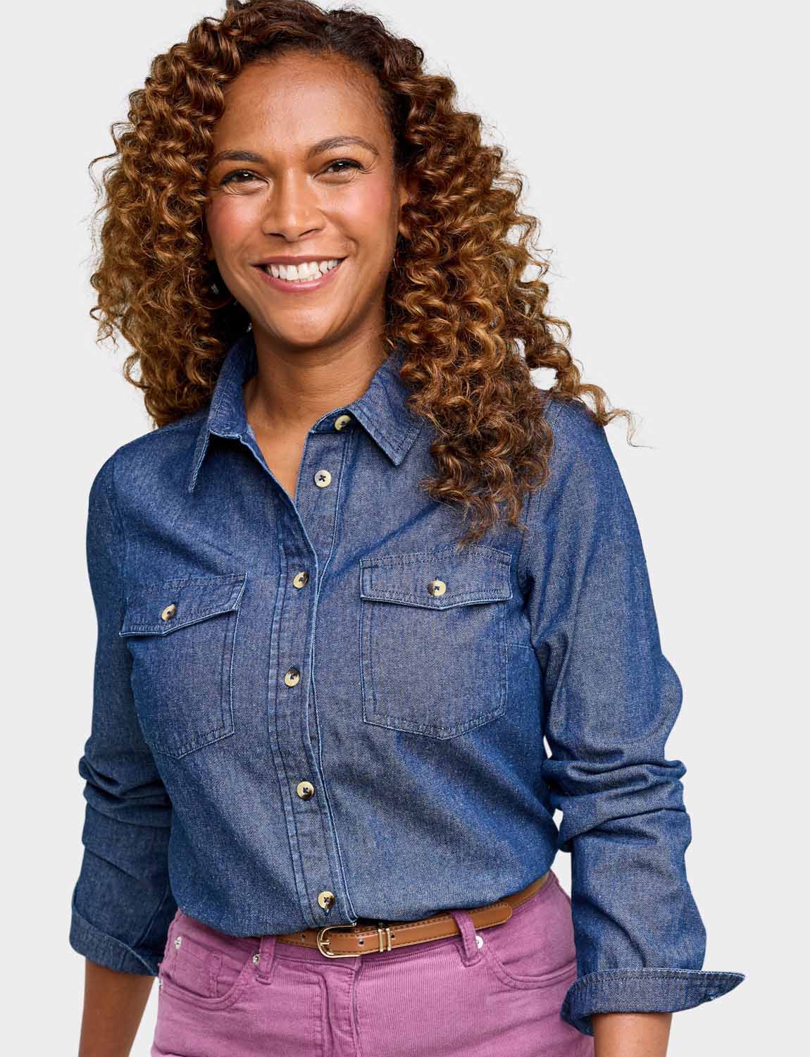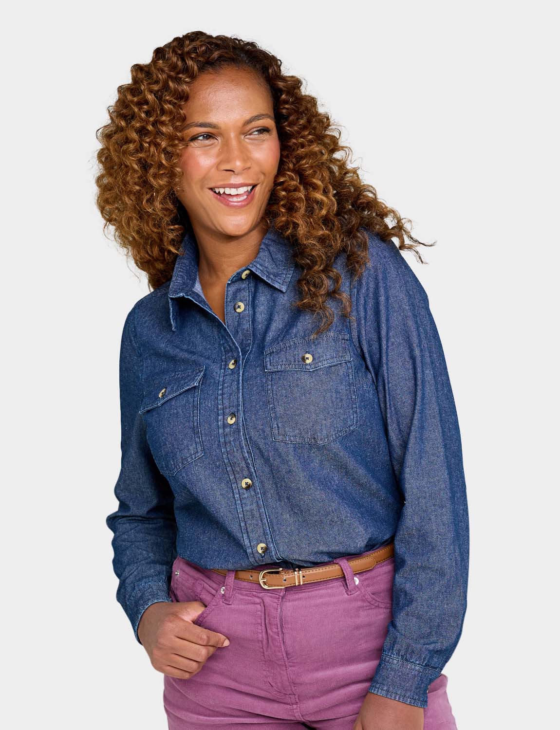 Long sleeve button front lightweight denim shirt with 2 chest pockets.