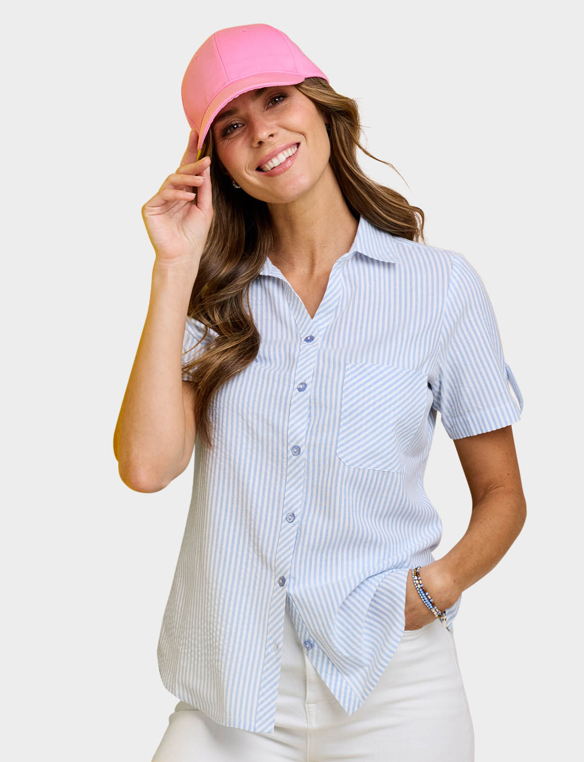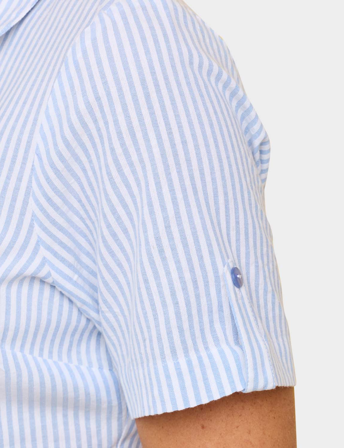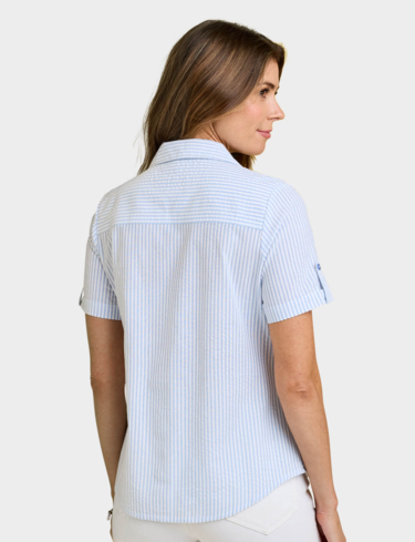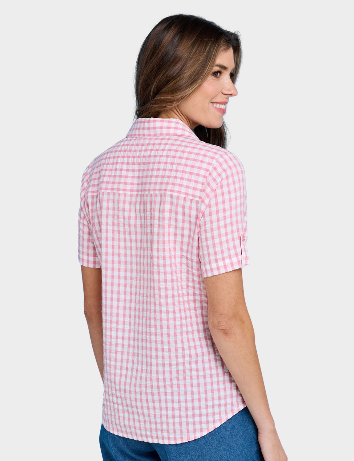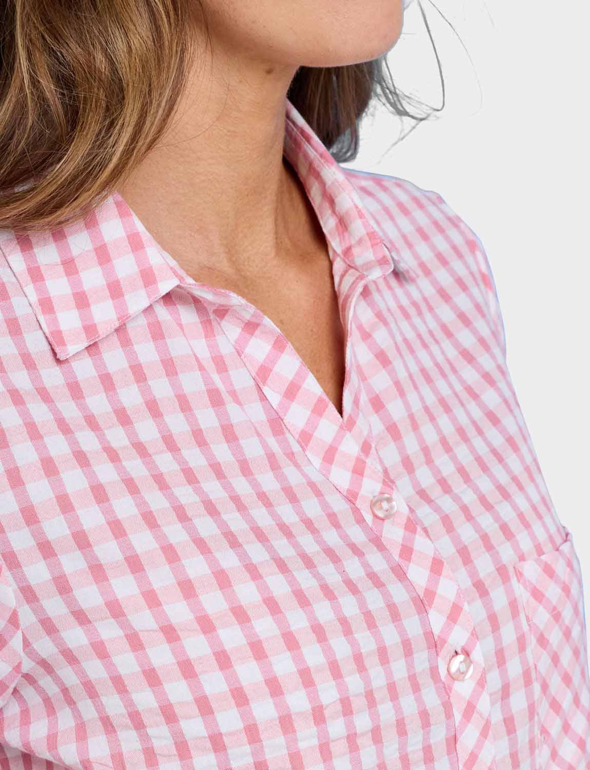 Short sleeve with tab button detail and front chest pocket. Length approx. 27".Pink is a check design and Blue is a stripe design .
