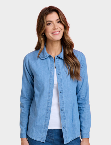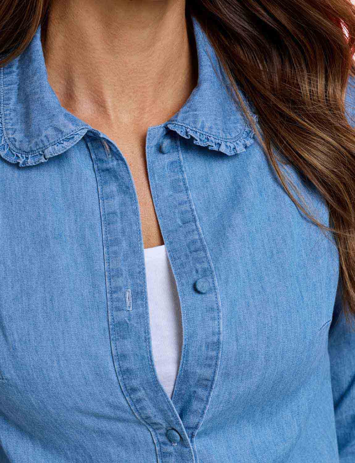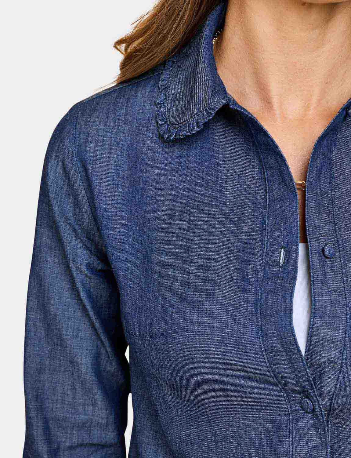 Lightweight denim fabric blouse with covered buttons. Long sleeves. Length approx. 27".