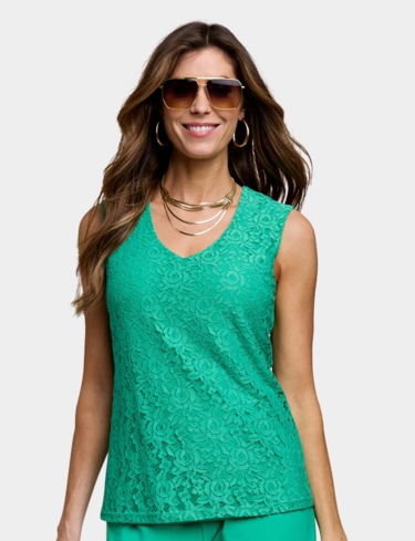 Luxury lace waterfall style jacket with v-neck sleeveless lace top and elasticated smooth waist jersey trouser.