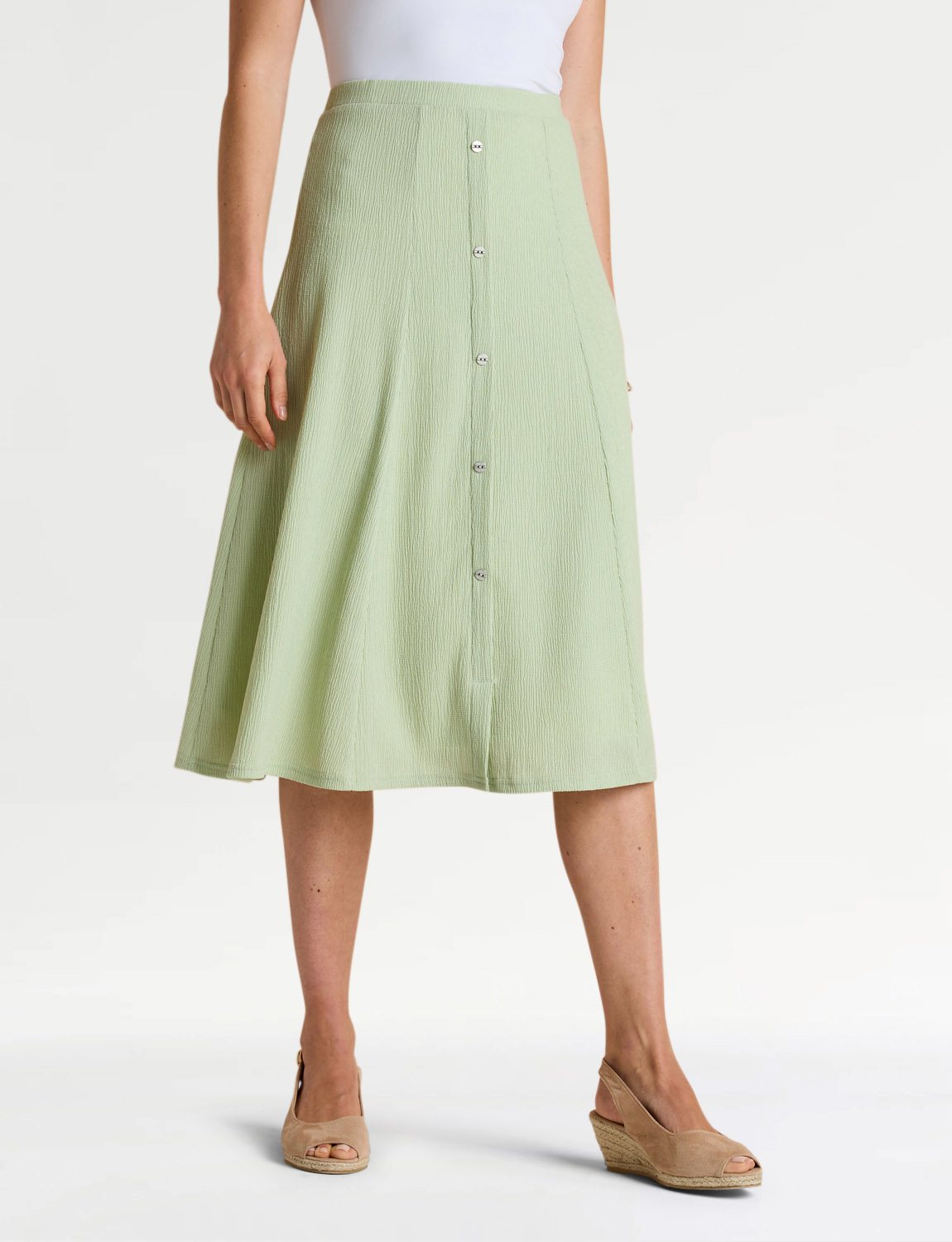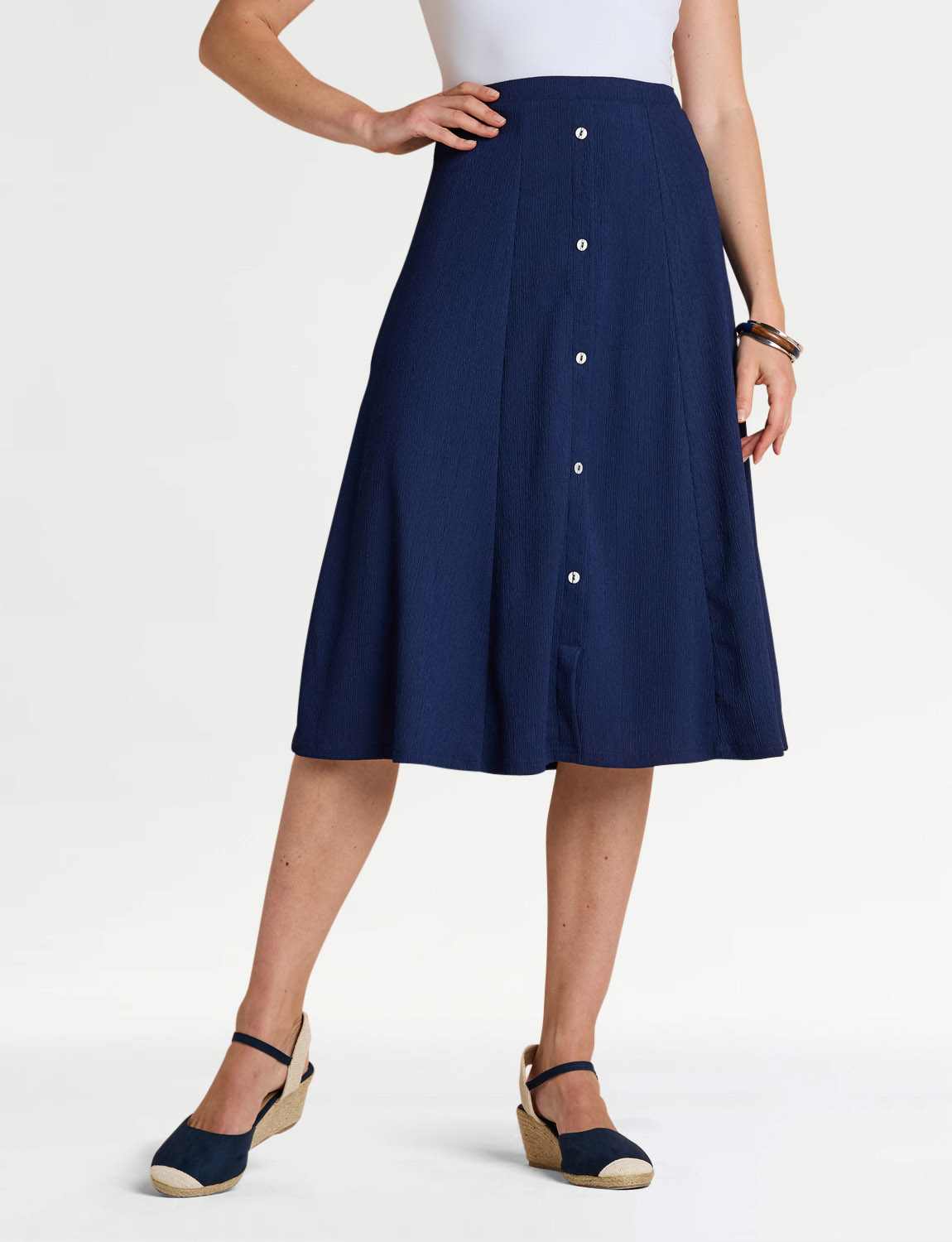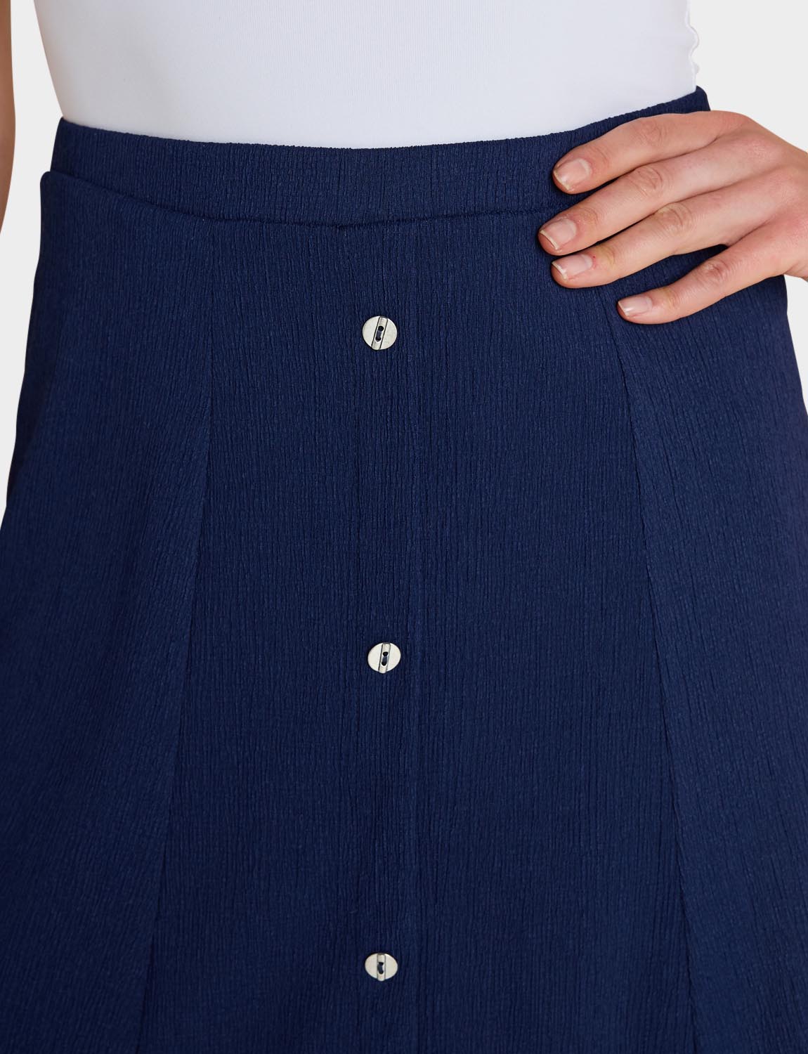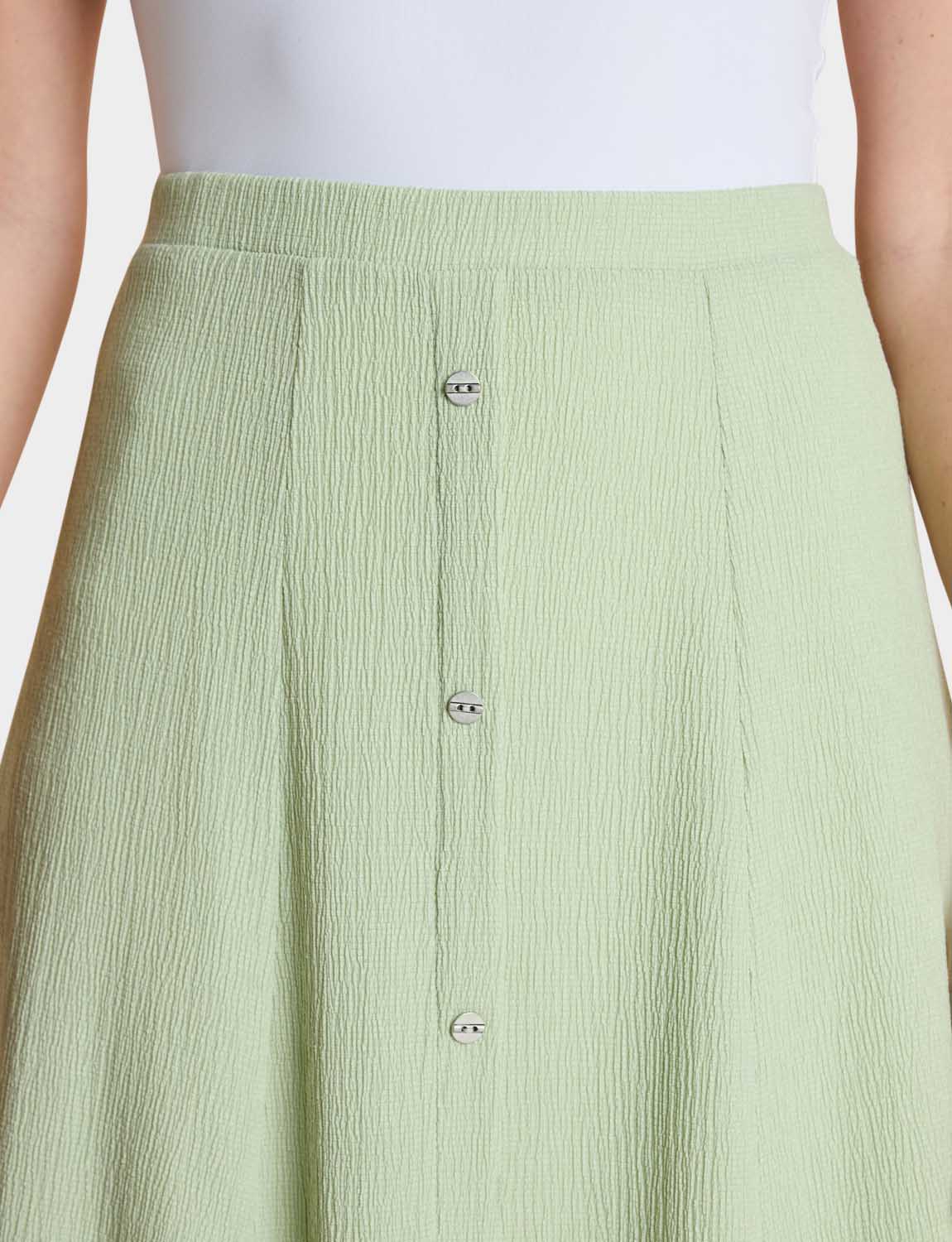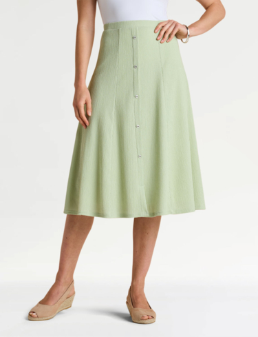 Smooth all-round elasticated waist panelled skirt in crinkle textured fabric. Mock button front fastening. Full lined.