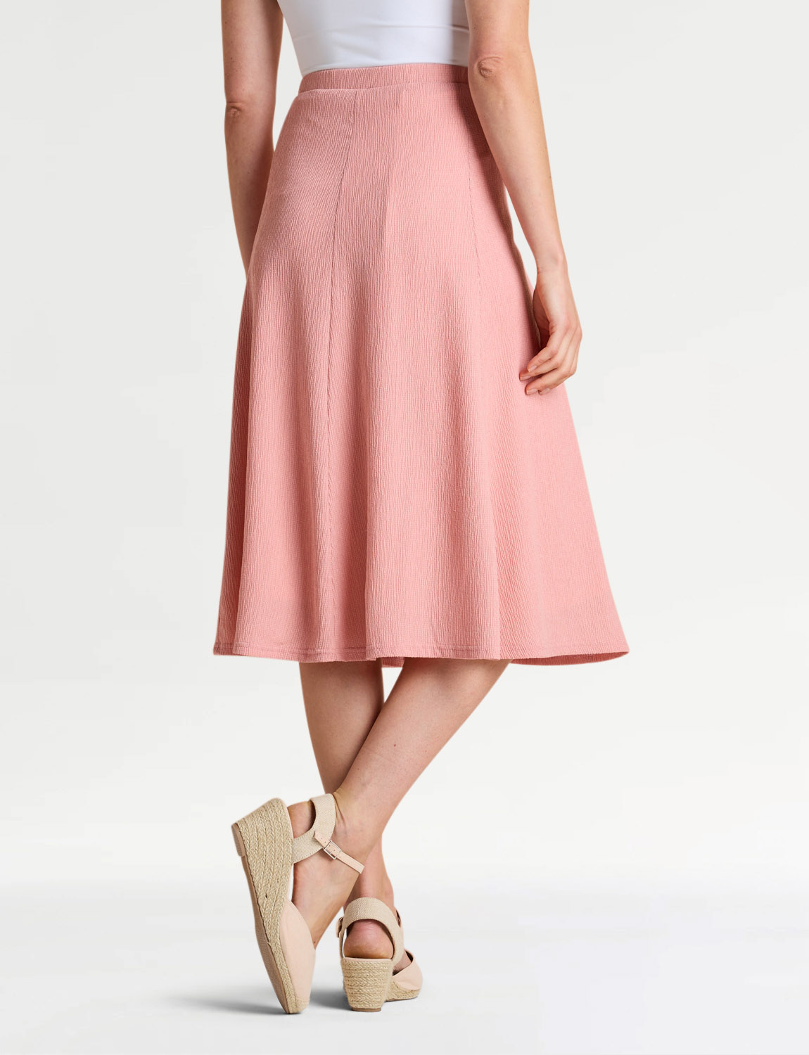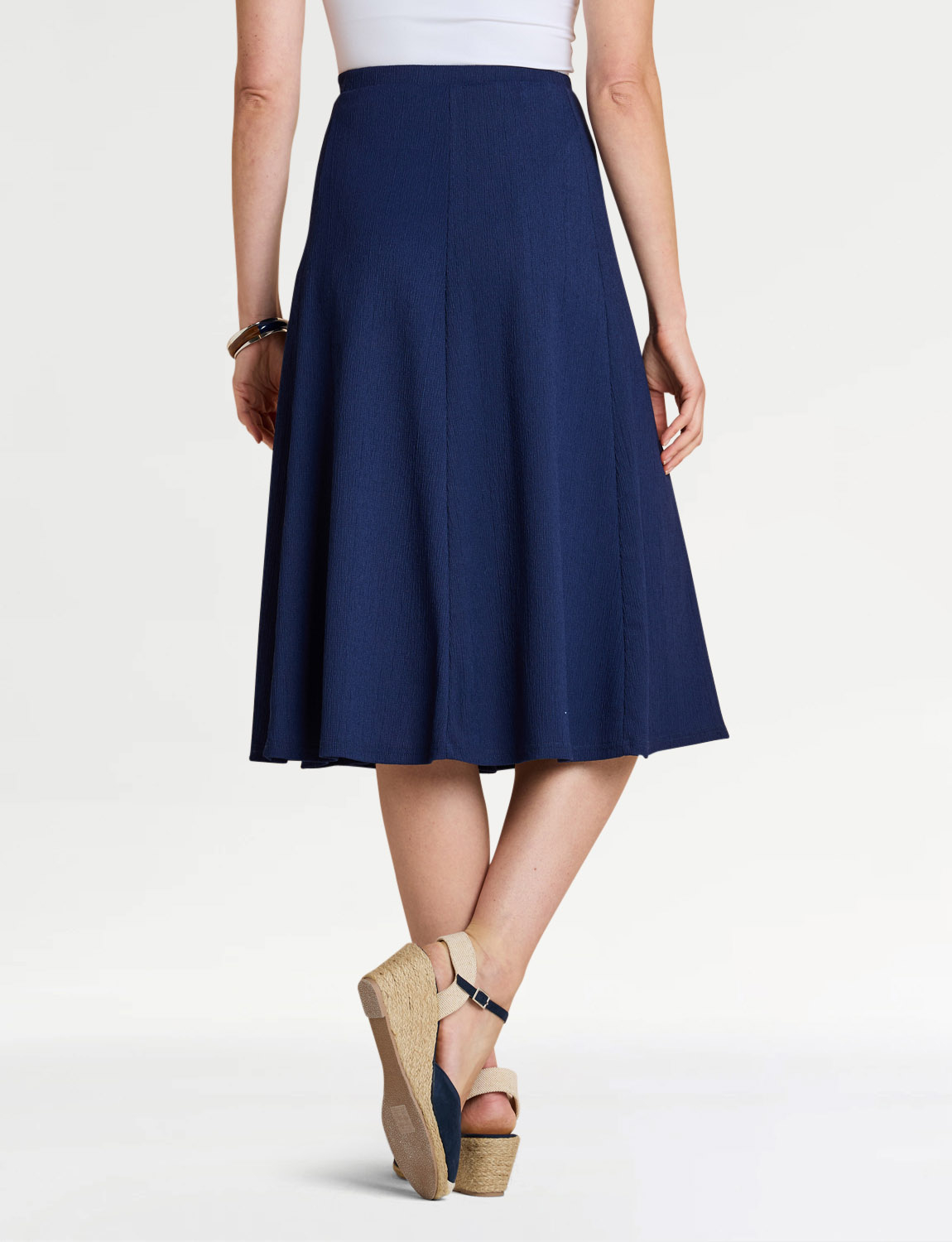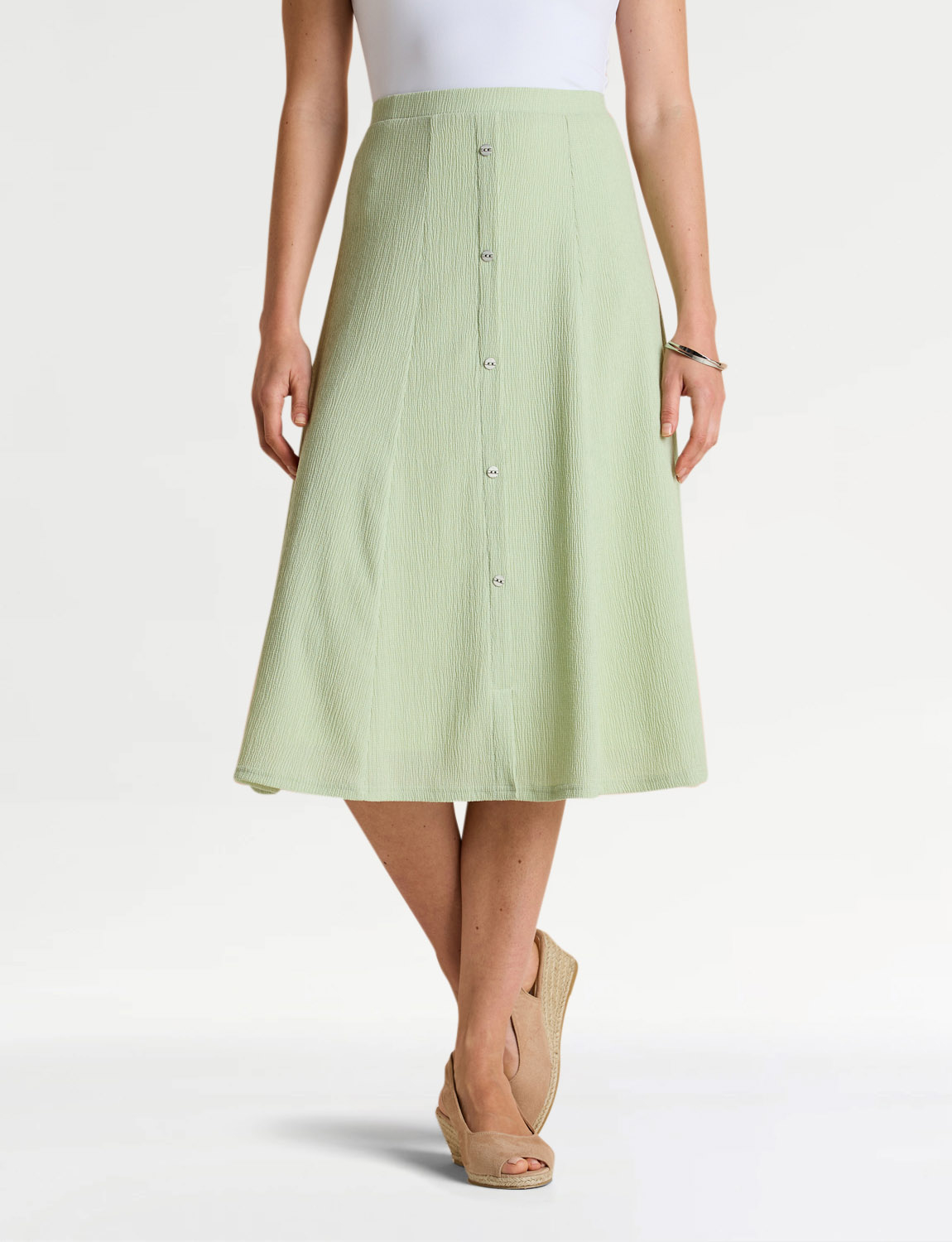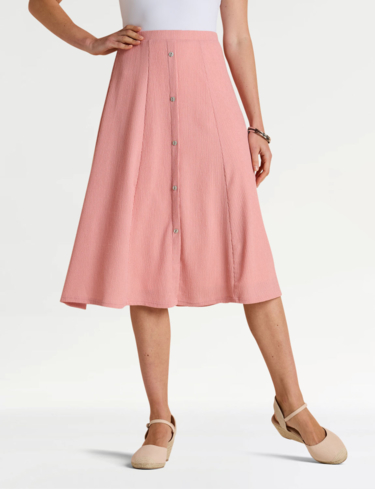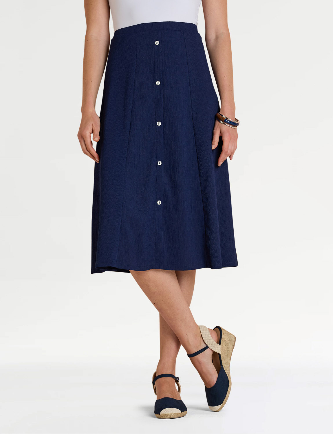 Smooth all-round elasticated waist panelled skirt in crinkle textured fabric. Mock button front fastening. Full lined.