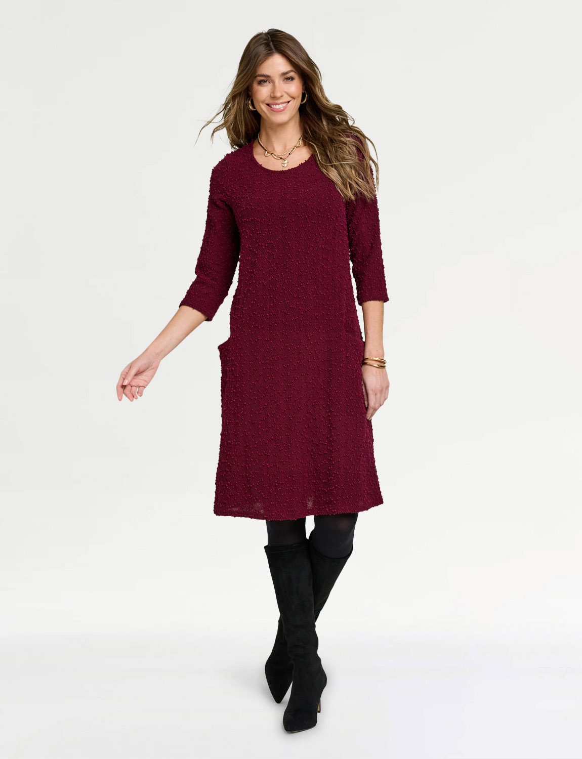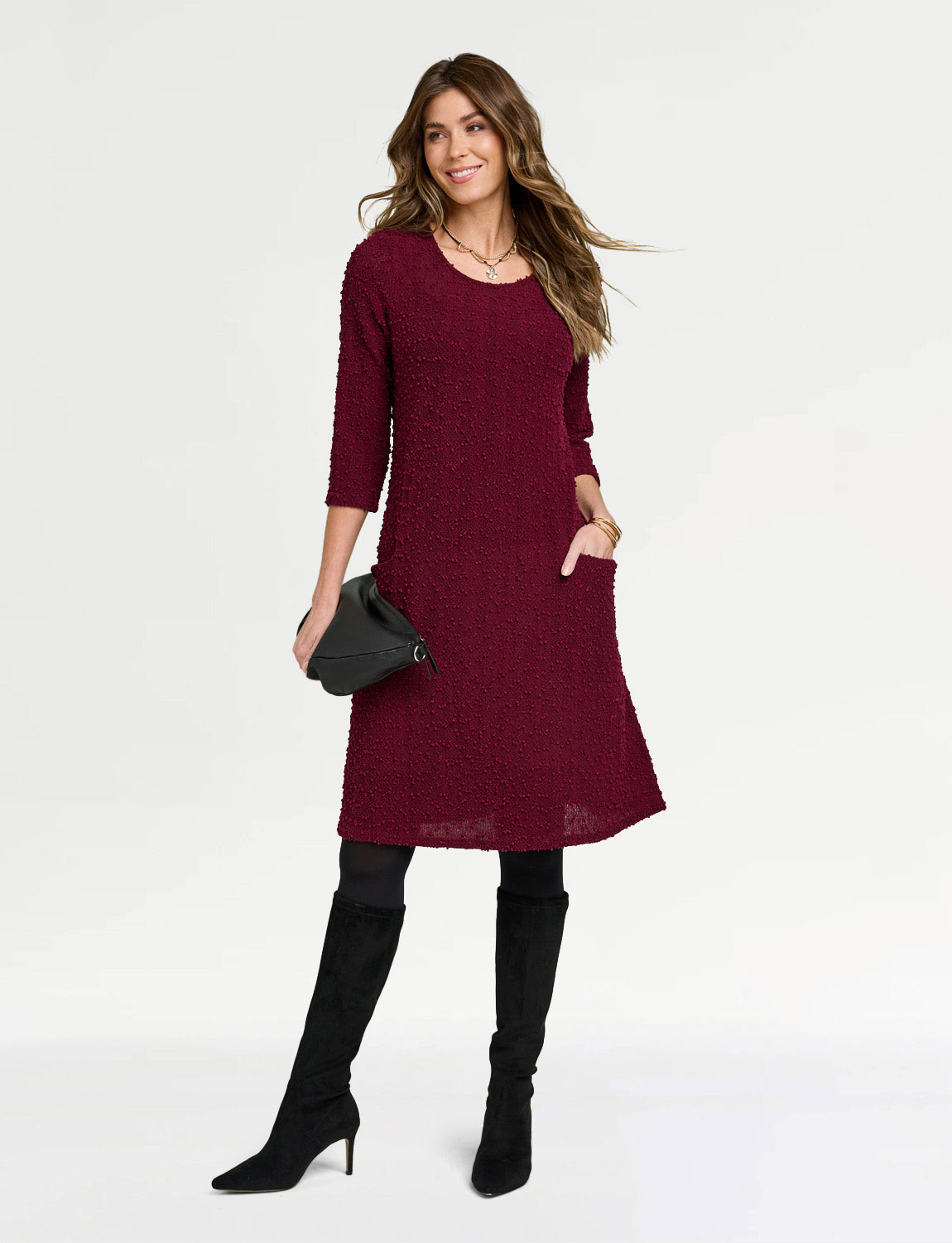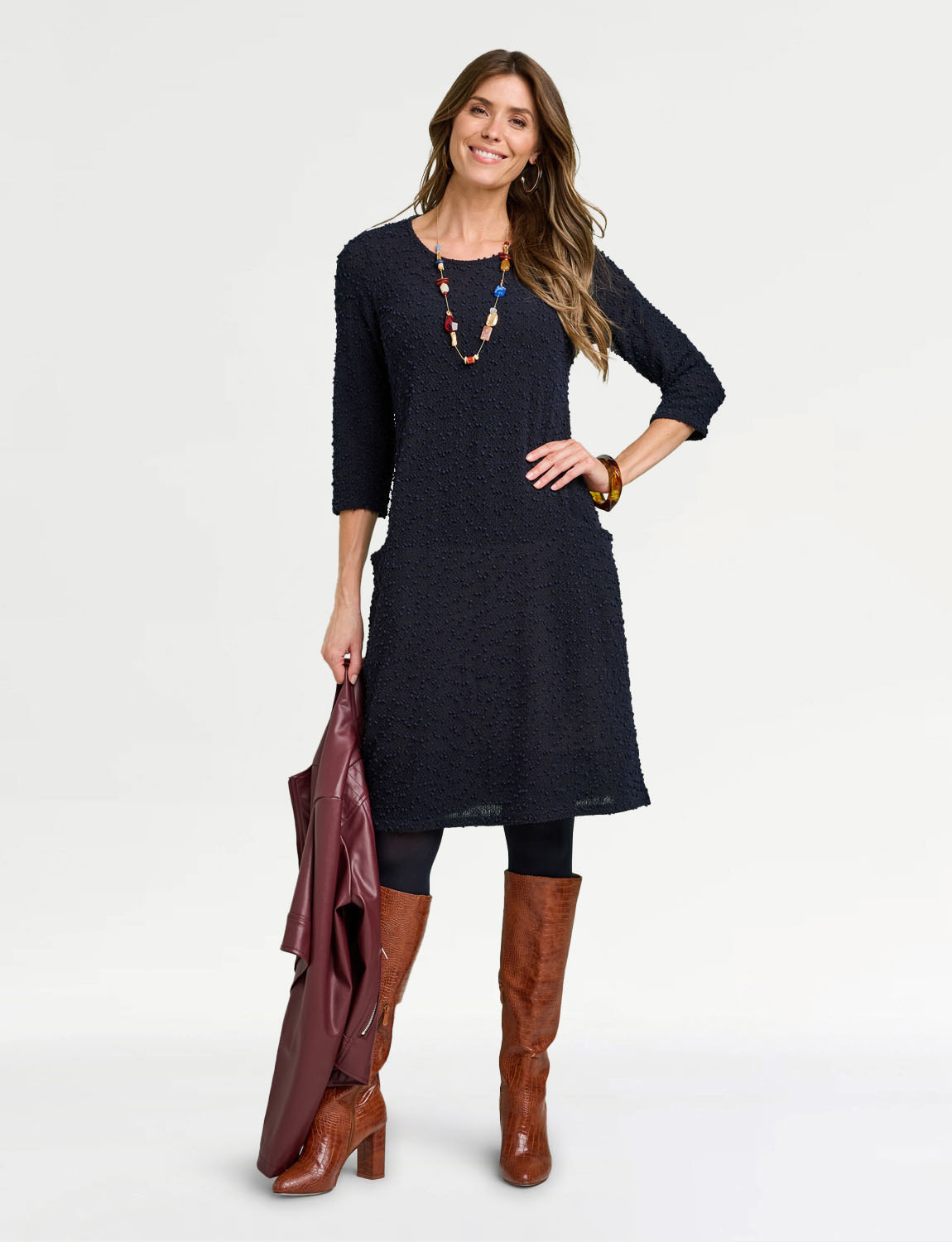 A-line shape dress with three quarter sleeves and 2 handy front pockets in a knitted boucle textured fabric.