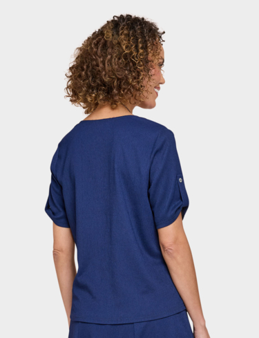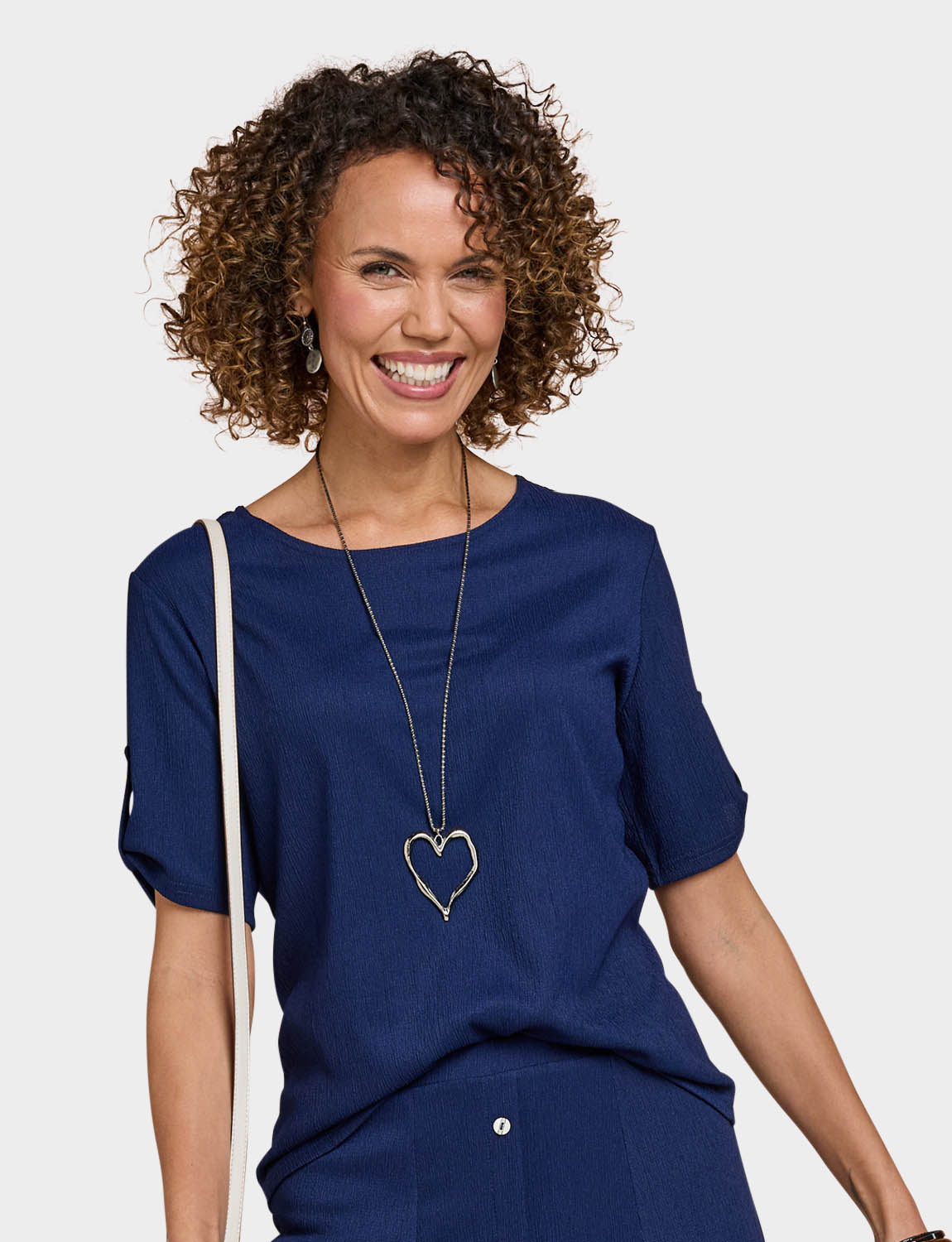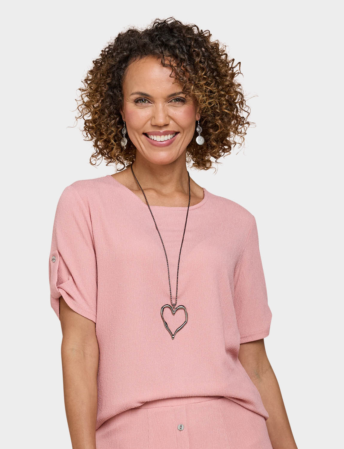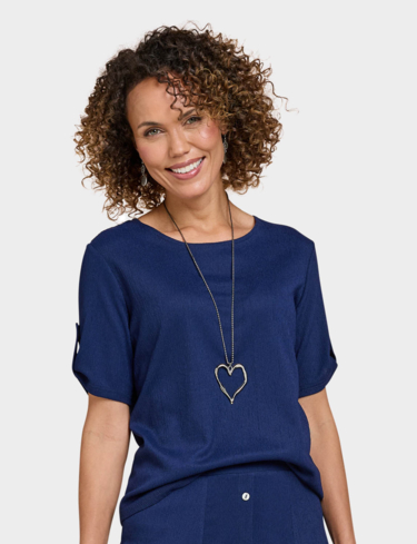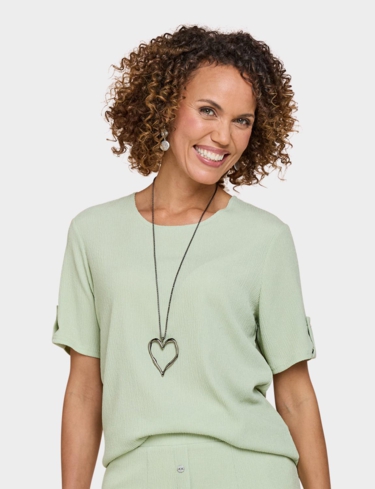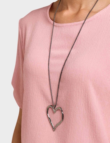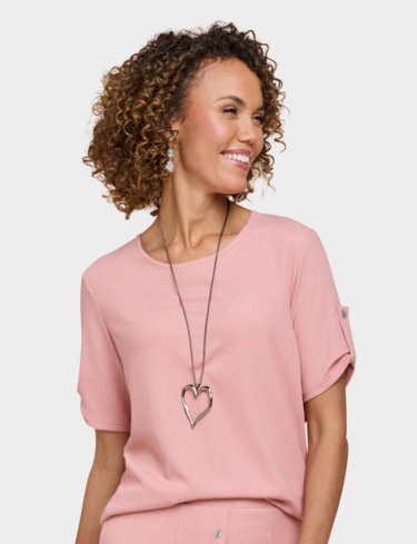 Short sleeves scoop neck top with tab cuff detail. Silver coloured heart shape necklace. Length approx. 25.5".
