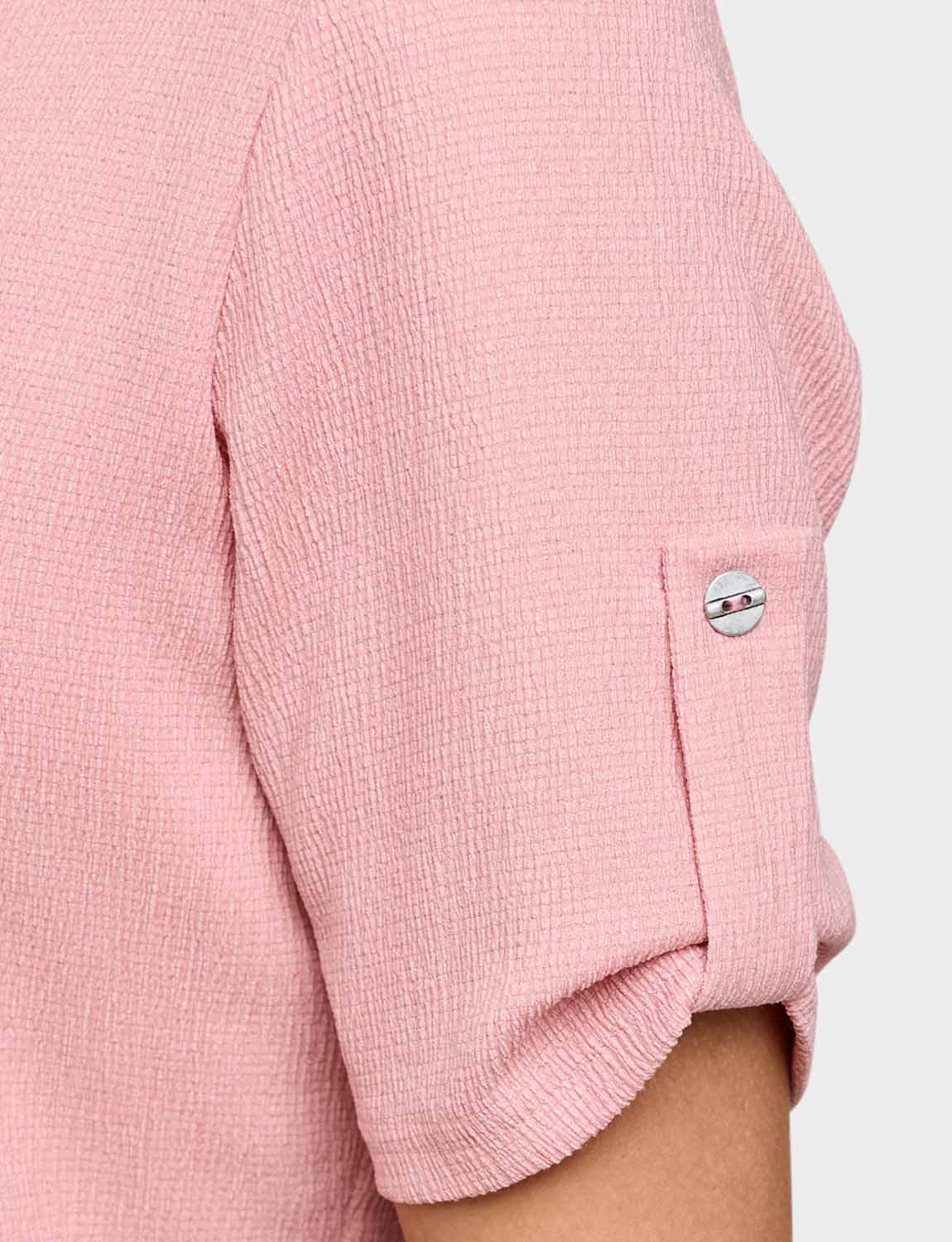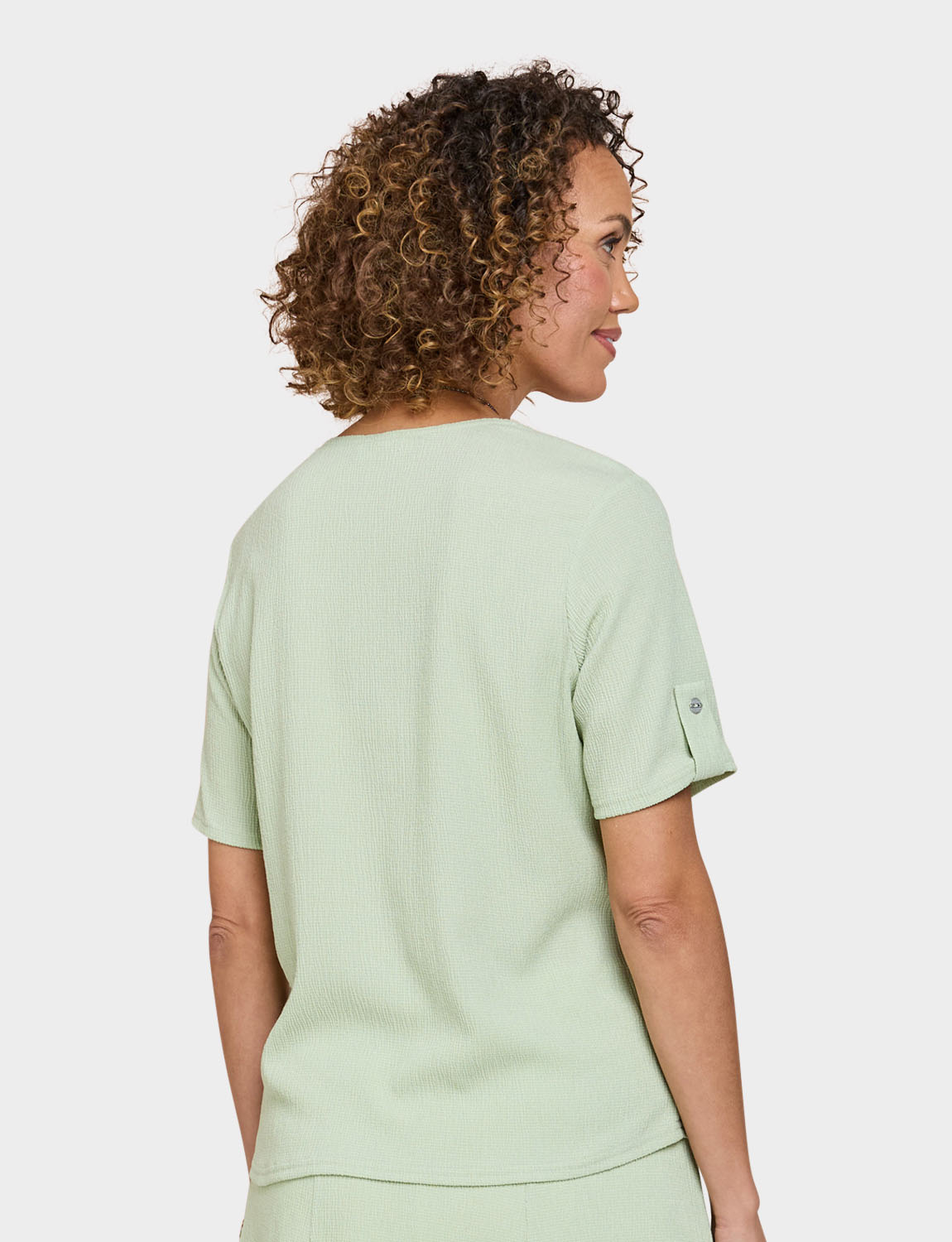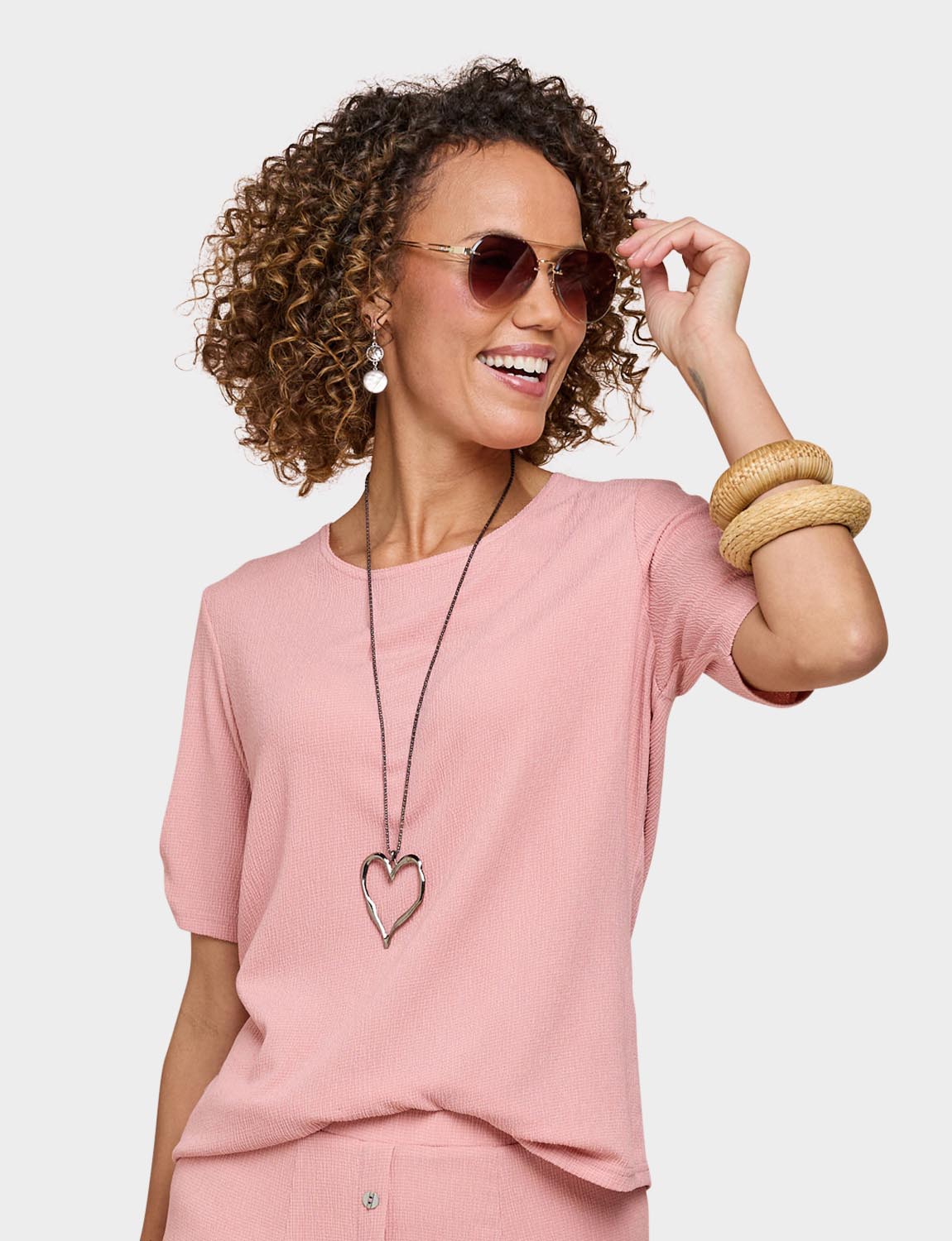Short sleeves scoop neck top with tab cuff detail. Silver coloured heart shape necklace. Length approx. 25.5".