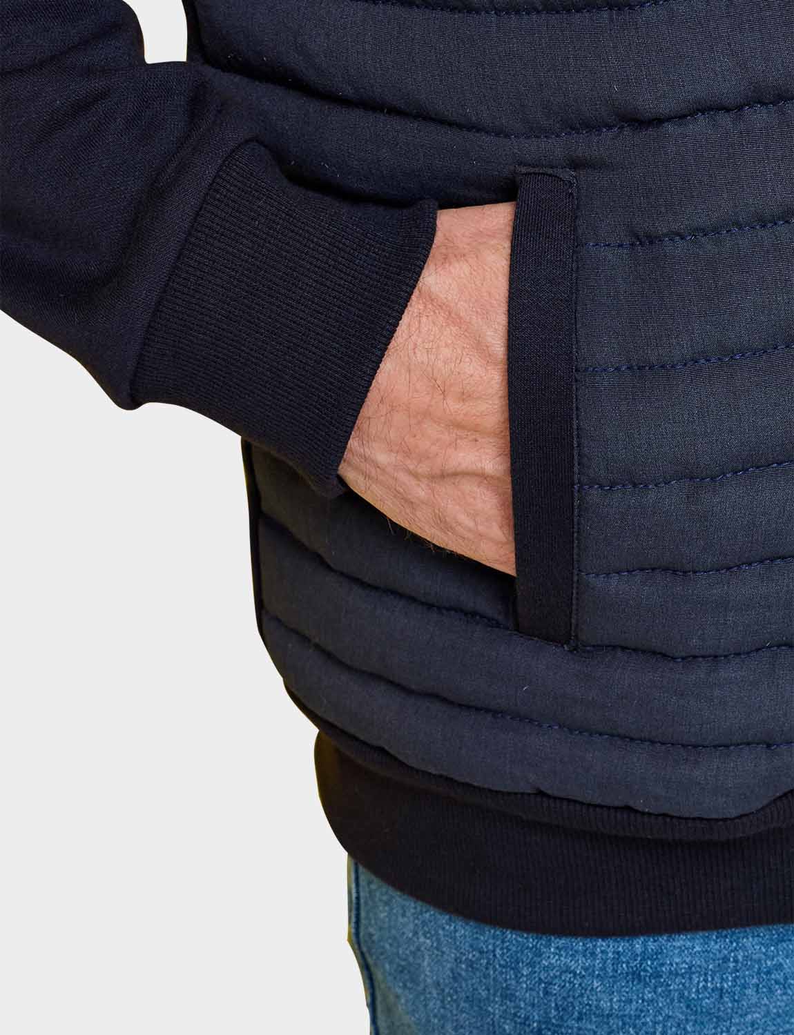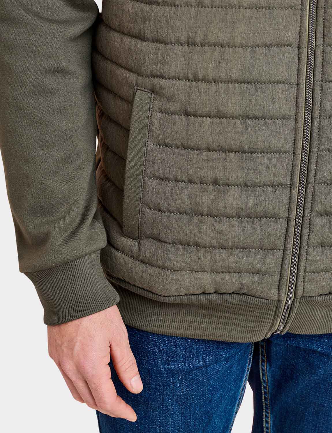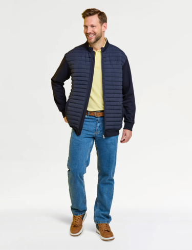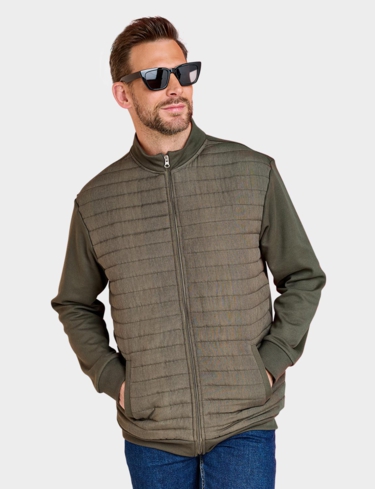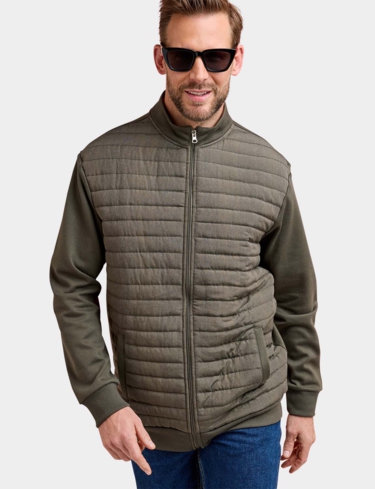 Knitted sweatshirt sleeves and back with a warm wadded quilted front panel for a hybrid look. This easy care style fastens with a zip and 2 pockets are added for functionality. Approx length 29".