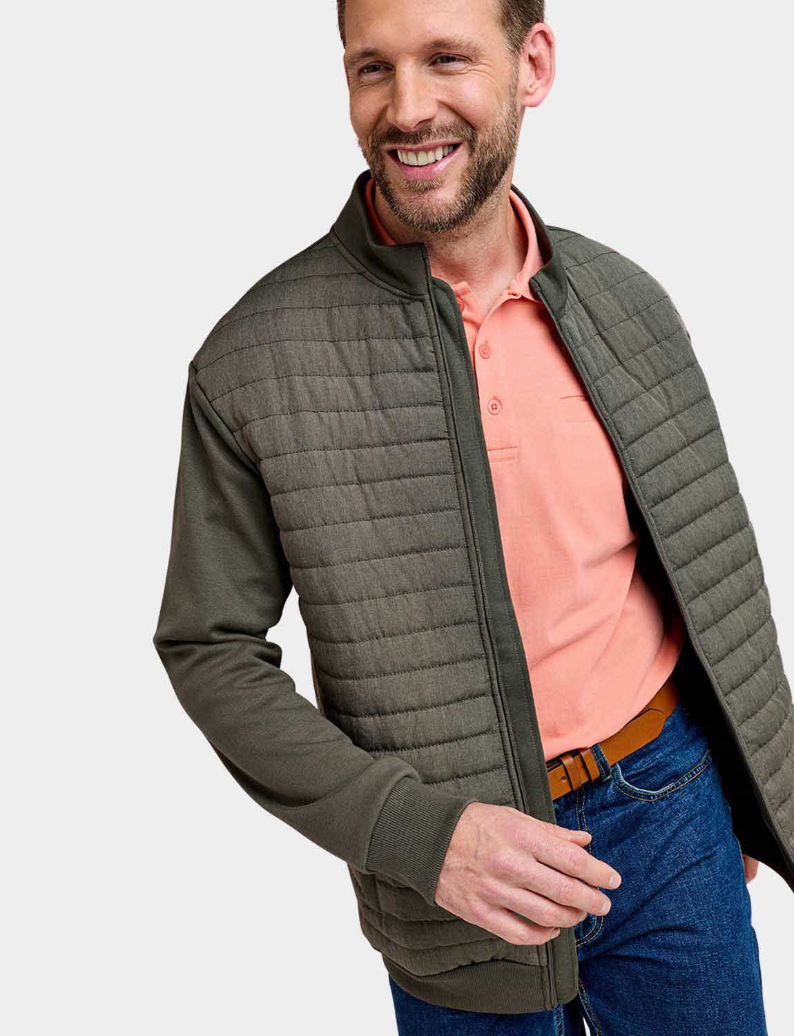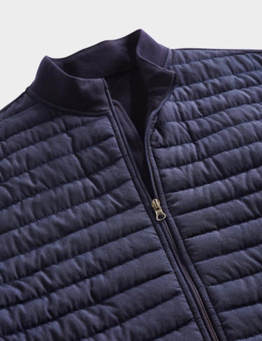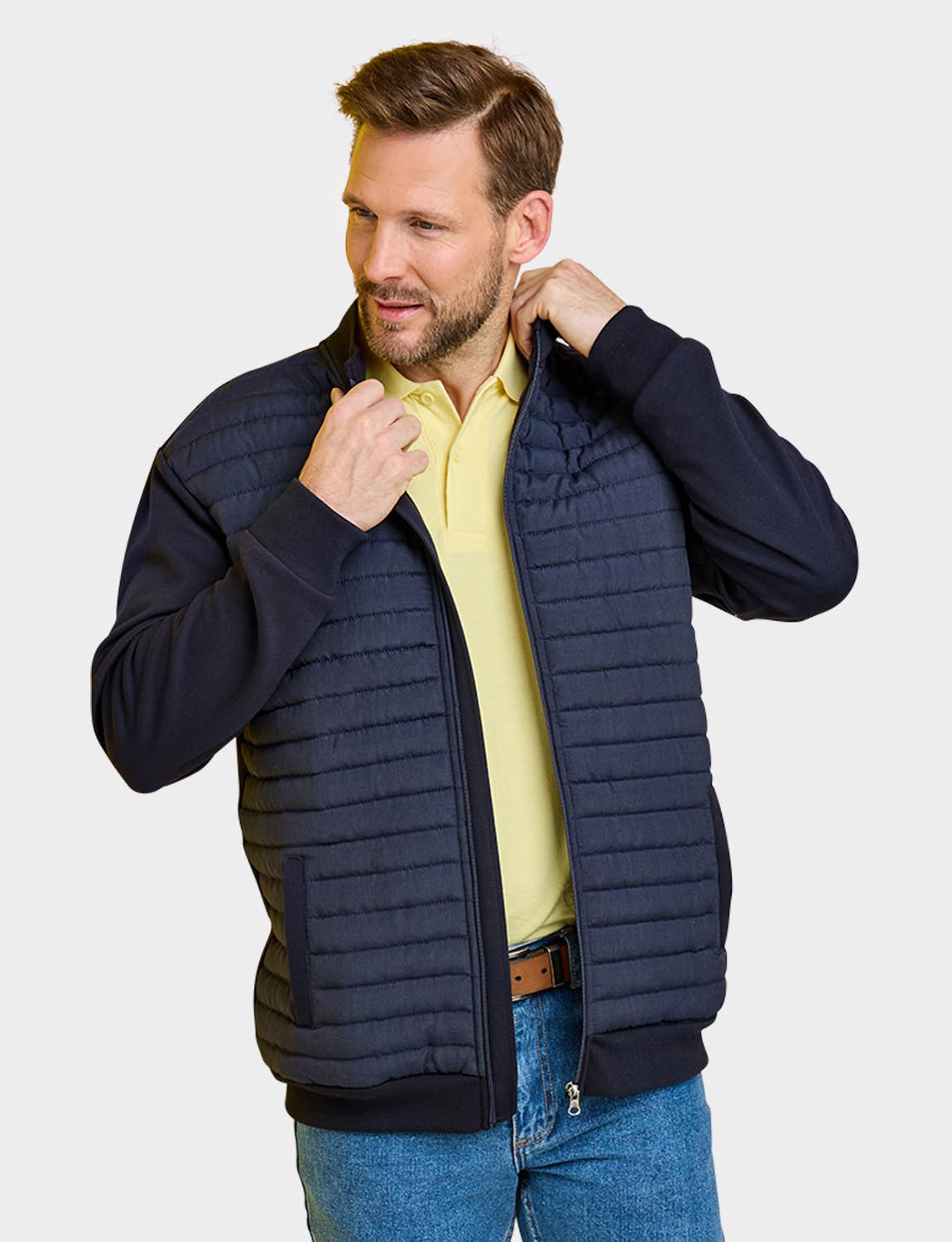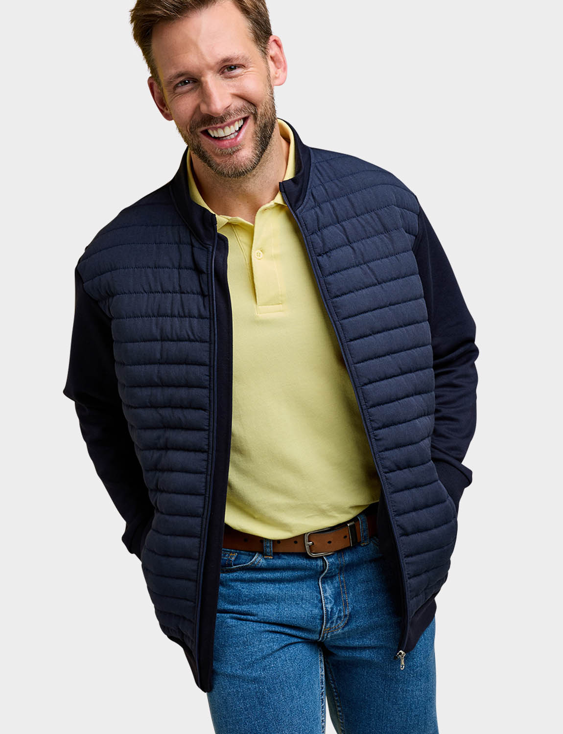 Knitted sweatshirt sleeves and back with a warm wadded quilted front panel for a hybrid look. This easy care style fastens with a zip and 2 pockets are added for functionality. Approx length 29".
