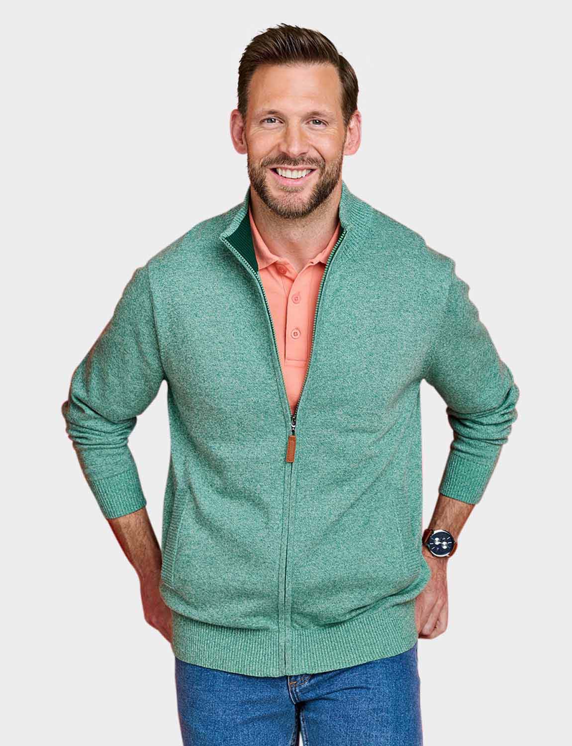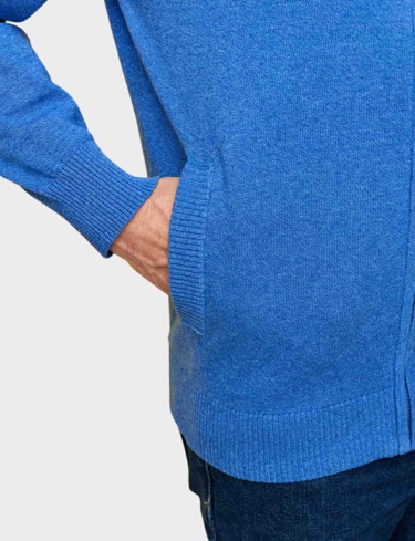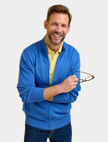 Zip through knitted jacket made from soft cotton yarn, 2 side pockets and contrast inner collar. Approx length 29".
