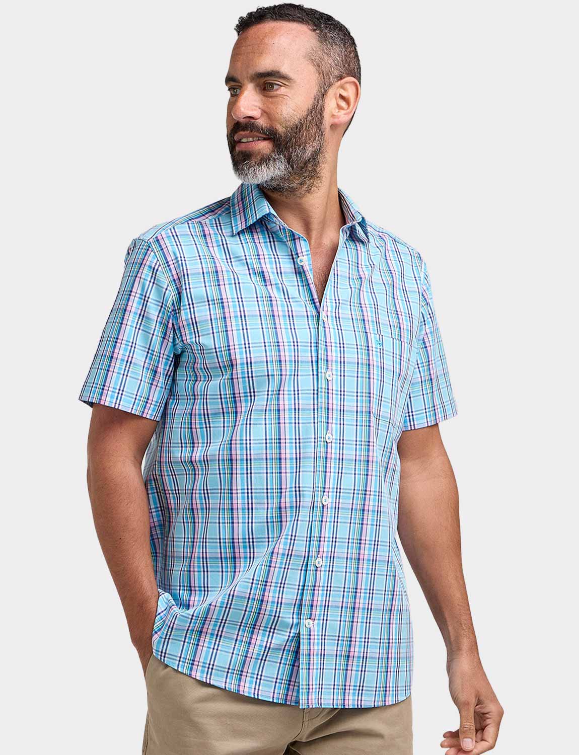 The light shades of blue come together to create a timeless plaid check pattern, perfect for adding a touch of sophistication to your look. With its standard collar, slightly swept tail, and twin pleat back, this short-sleeve shirt is not only stylish but also versatile. Pair it with shorts for a laid-back summer look, or dress it up with chinos for a more polished ensemble.