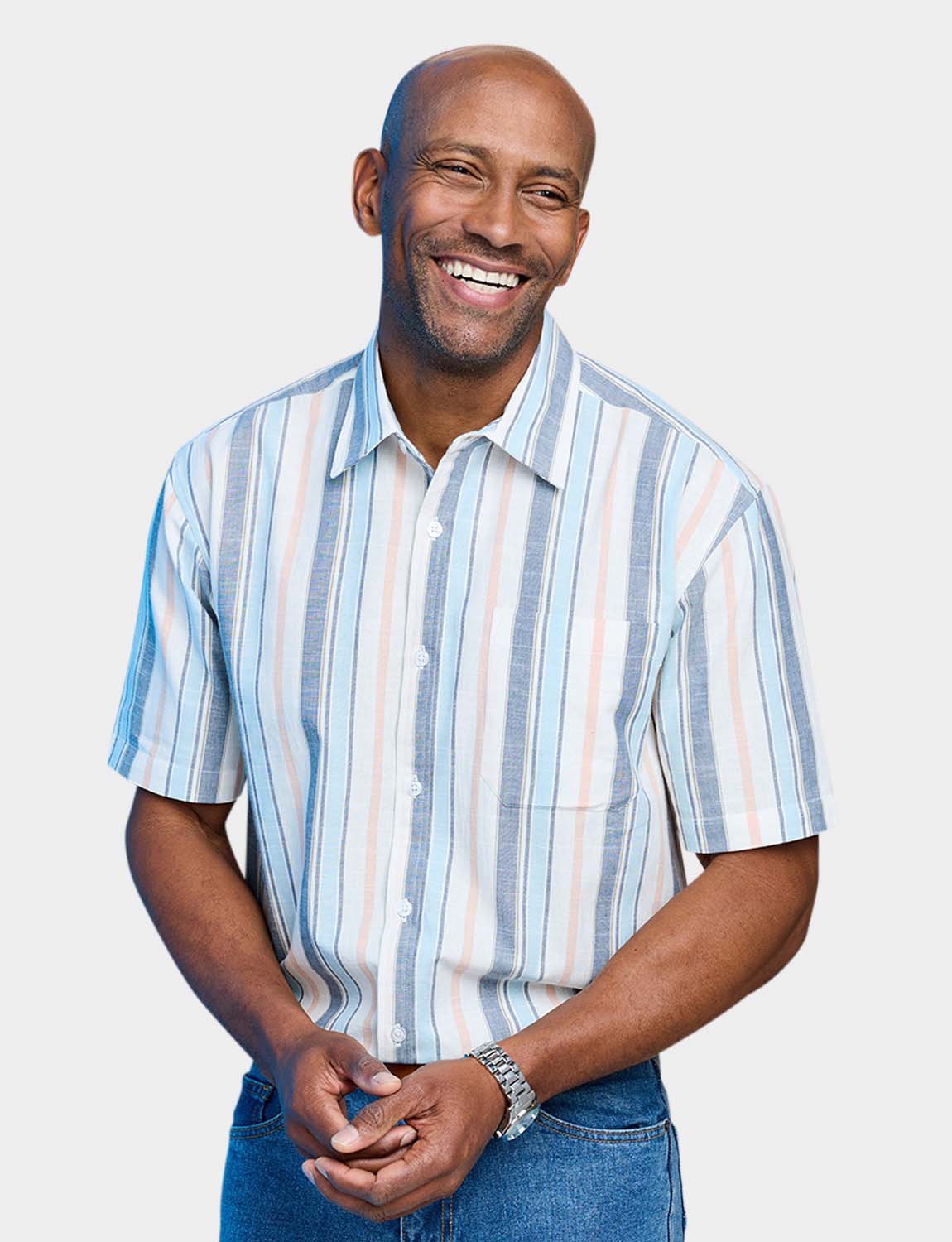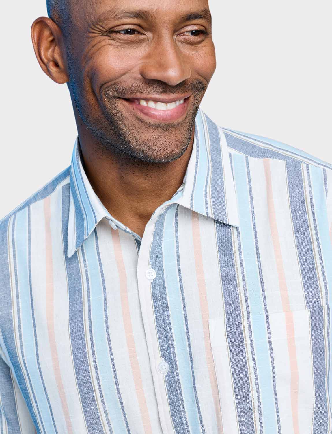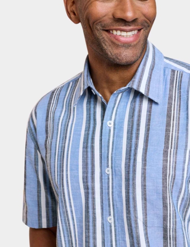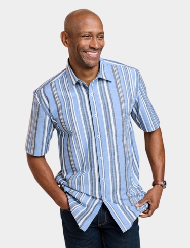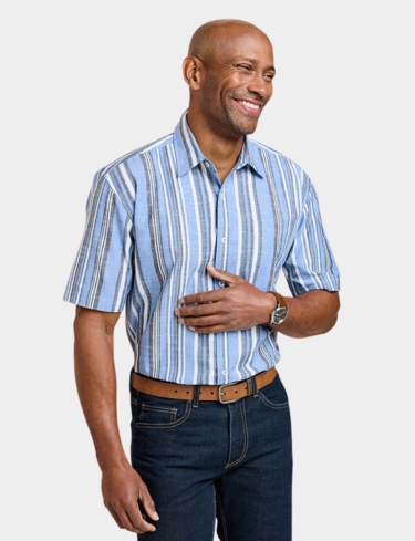 Short sleeve shirt with single chest pocket in soft handle yarn dyed stripe fabric. Comfort fit. Approx length 31".