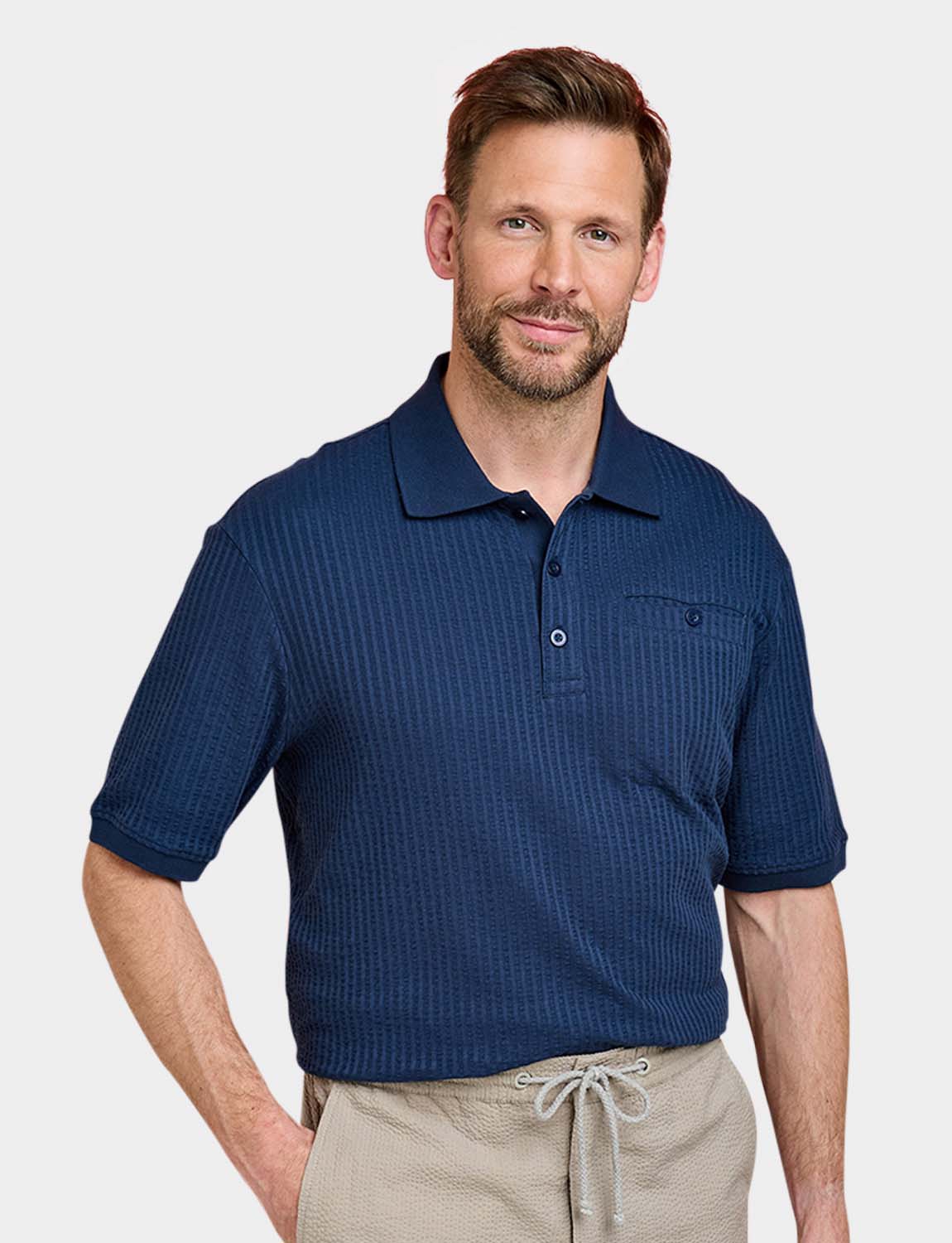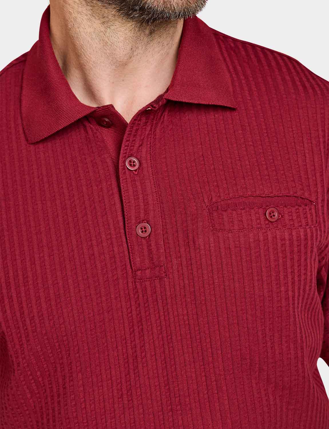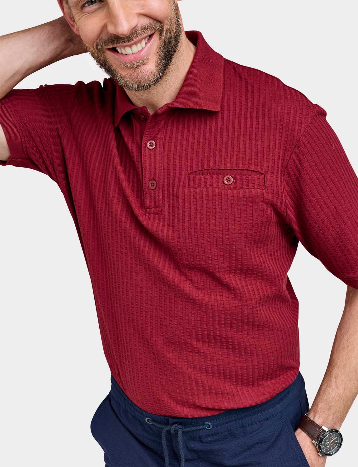 Polo in easy care seersucker fabric with chest pocket. Approx length 29".