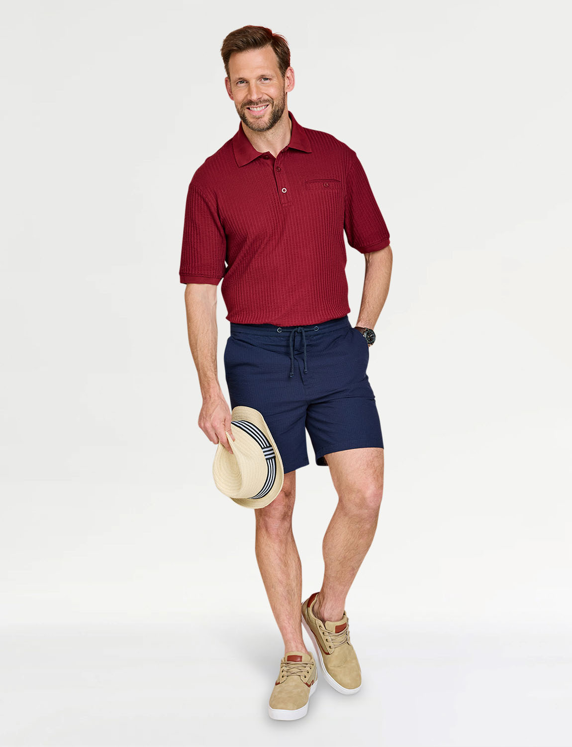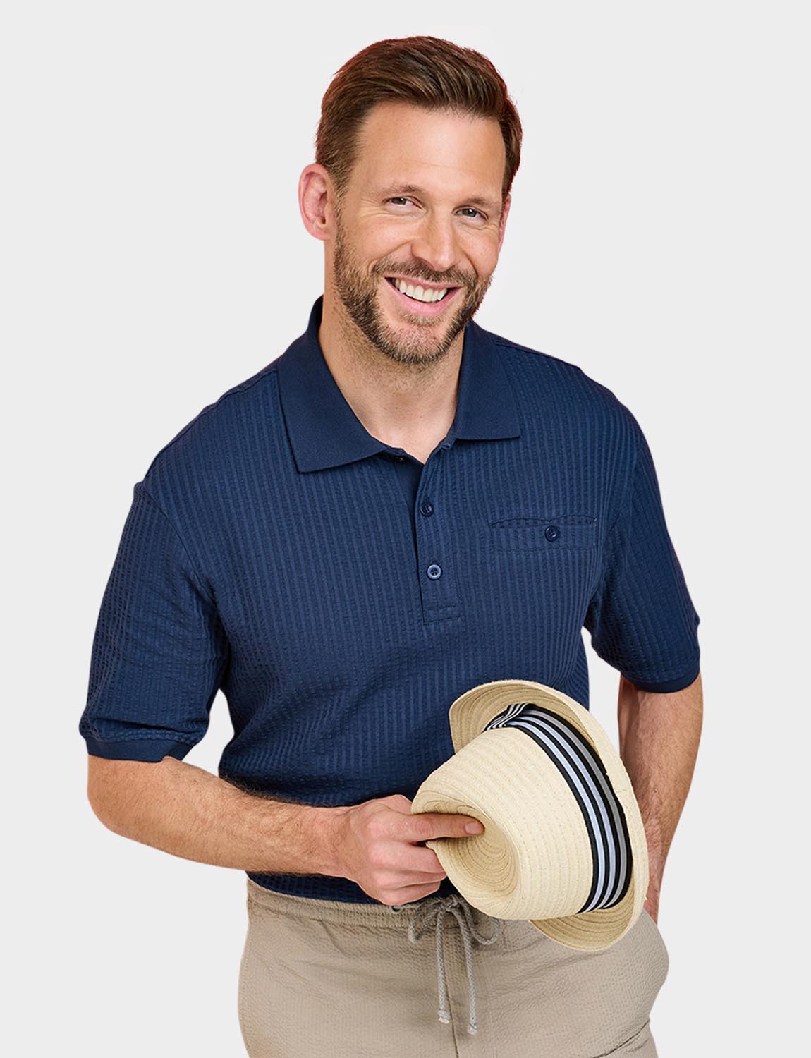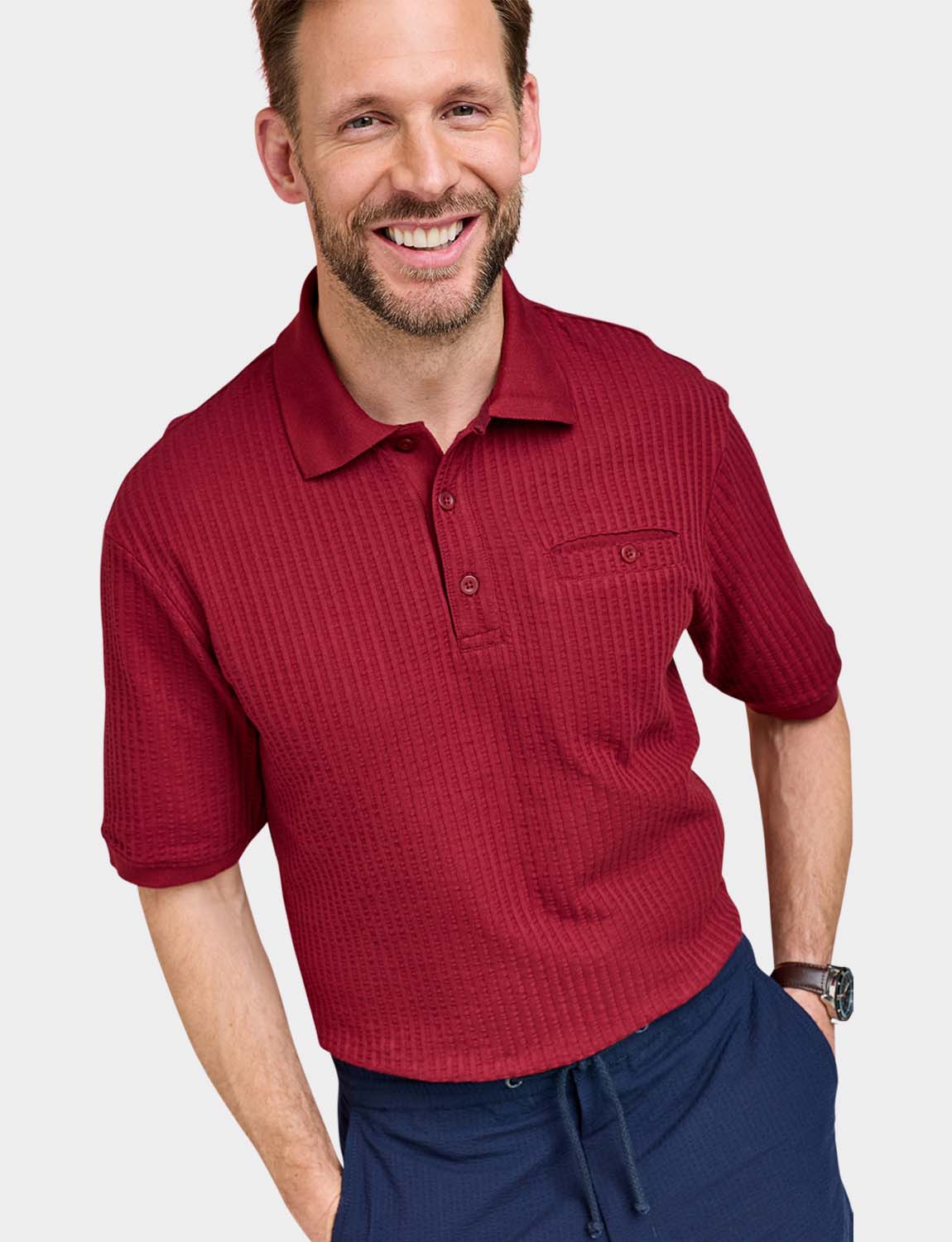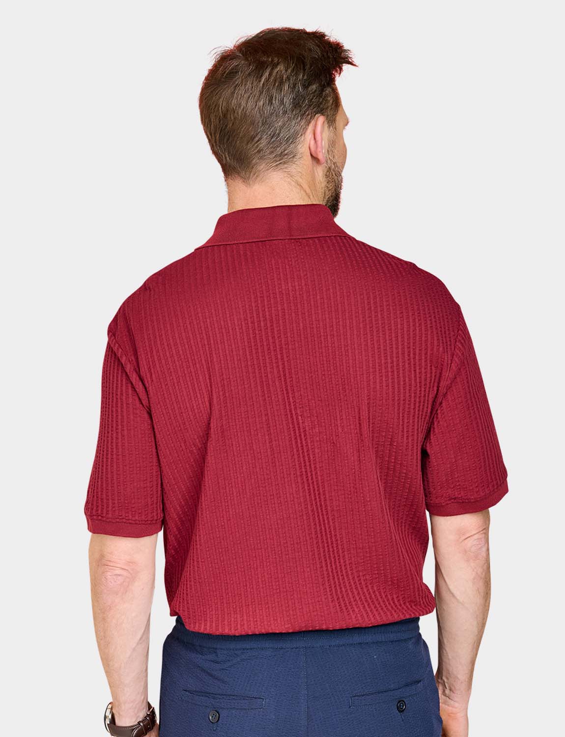Polo in easy care seersucker fabric with chest pocket. Approx length 29".