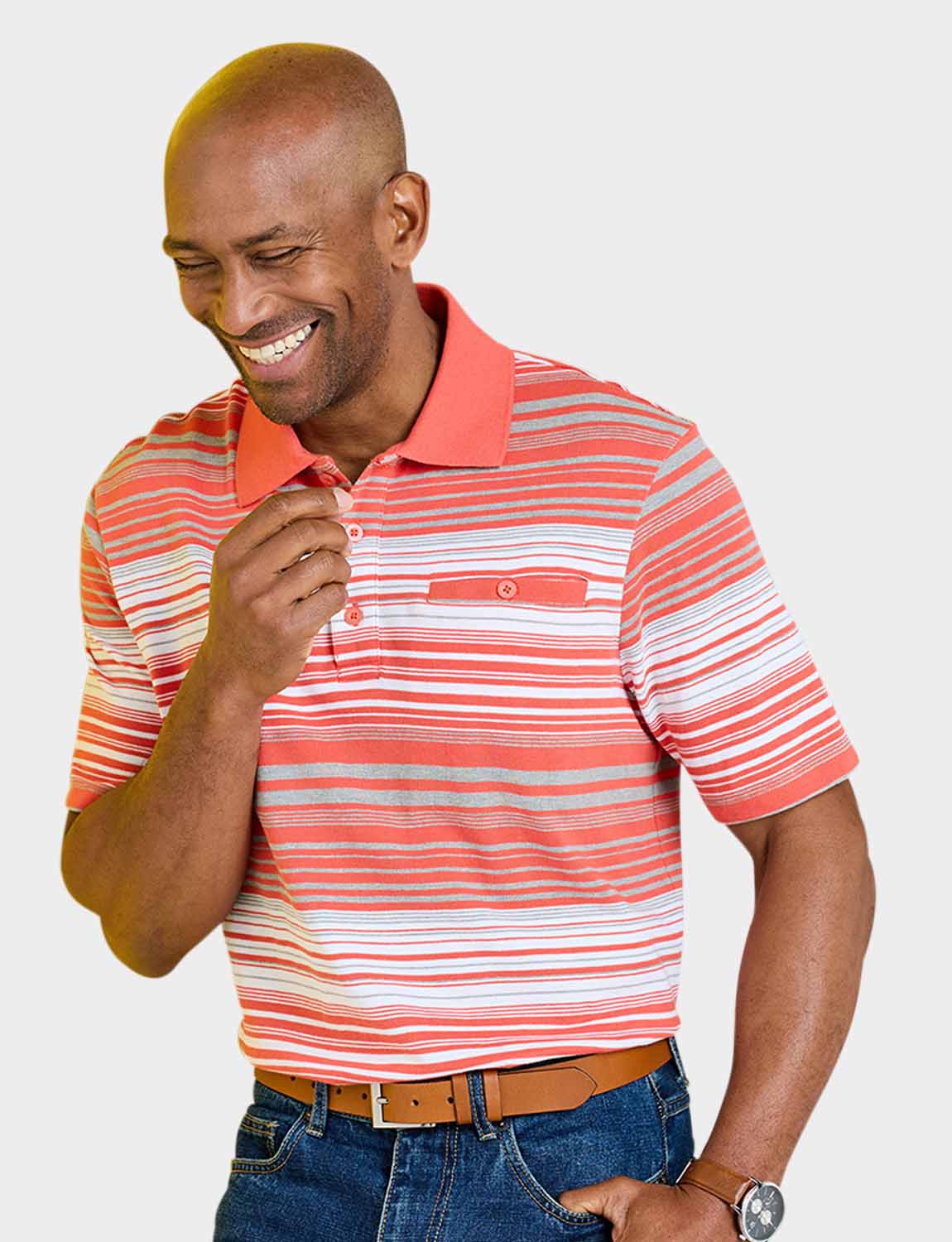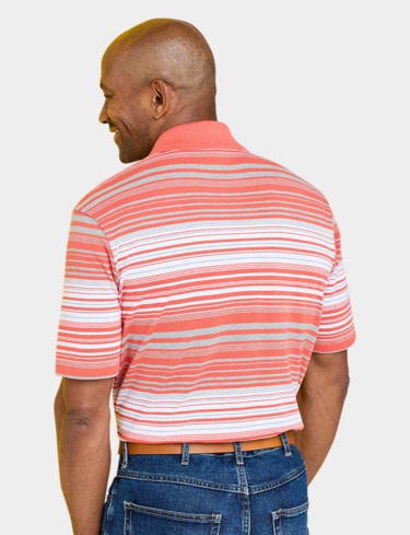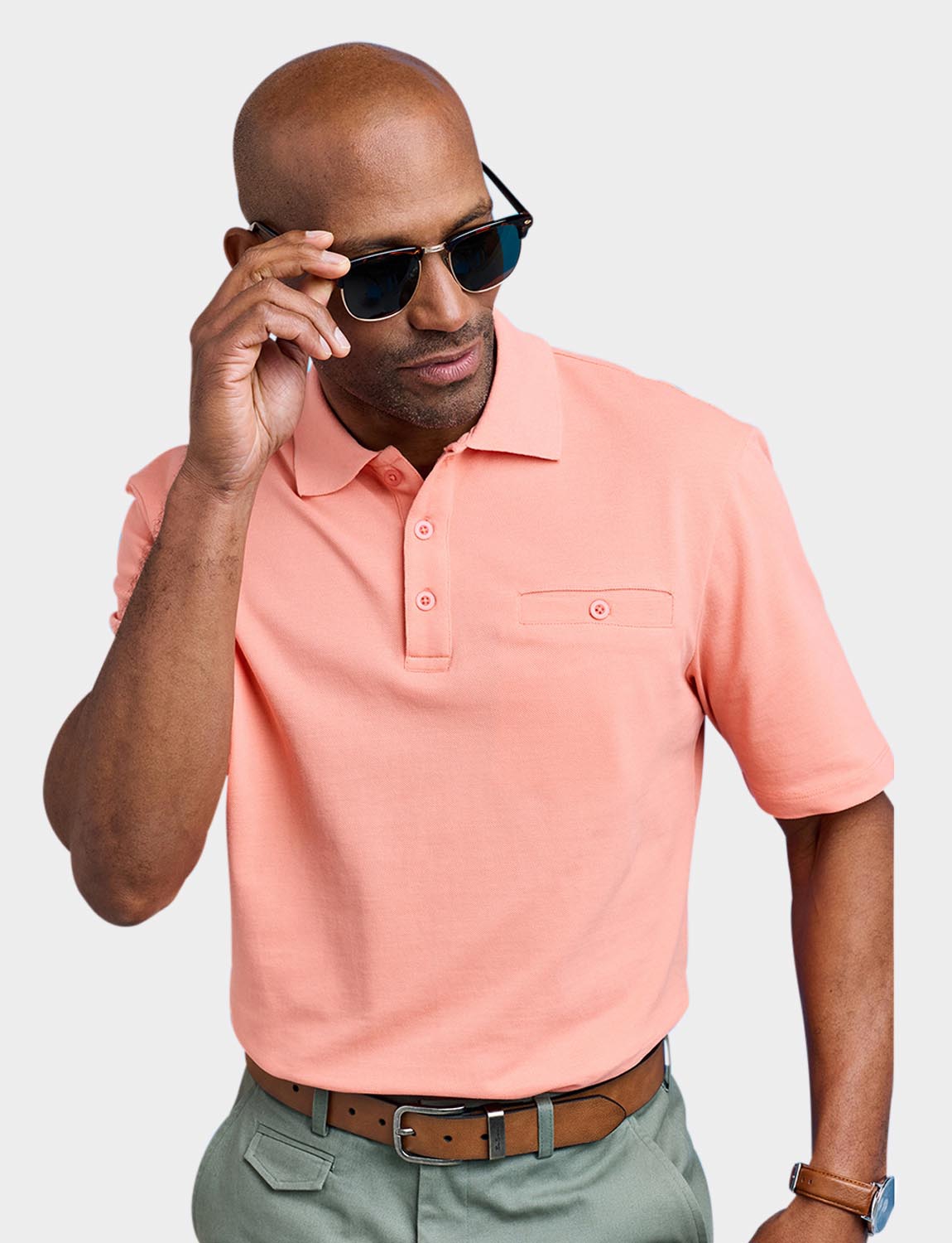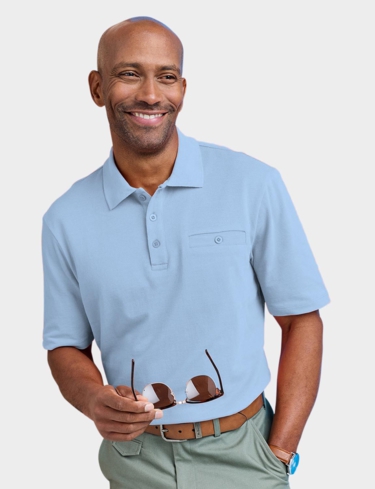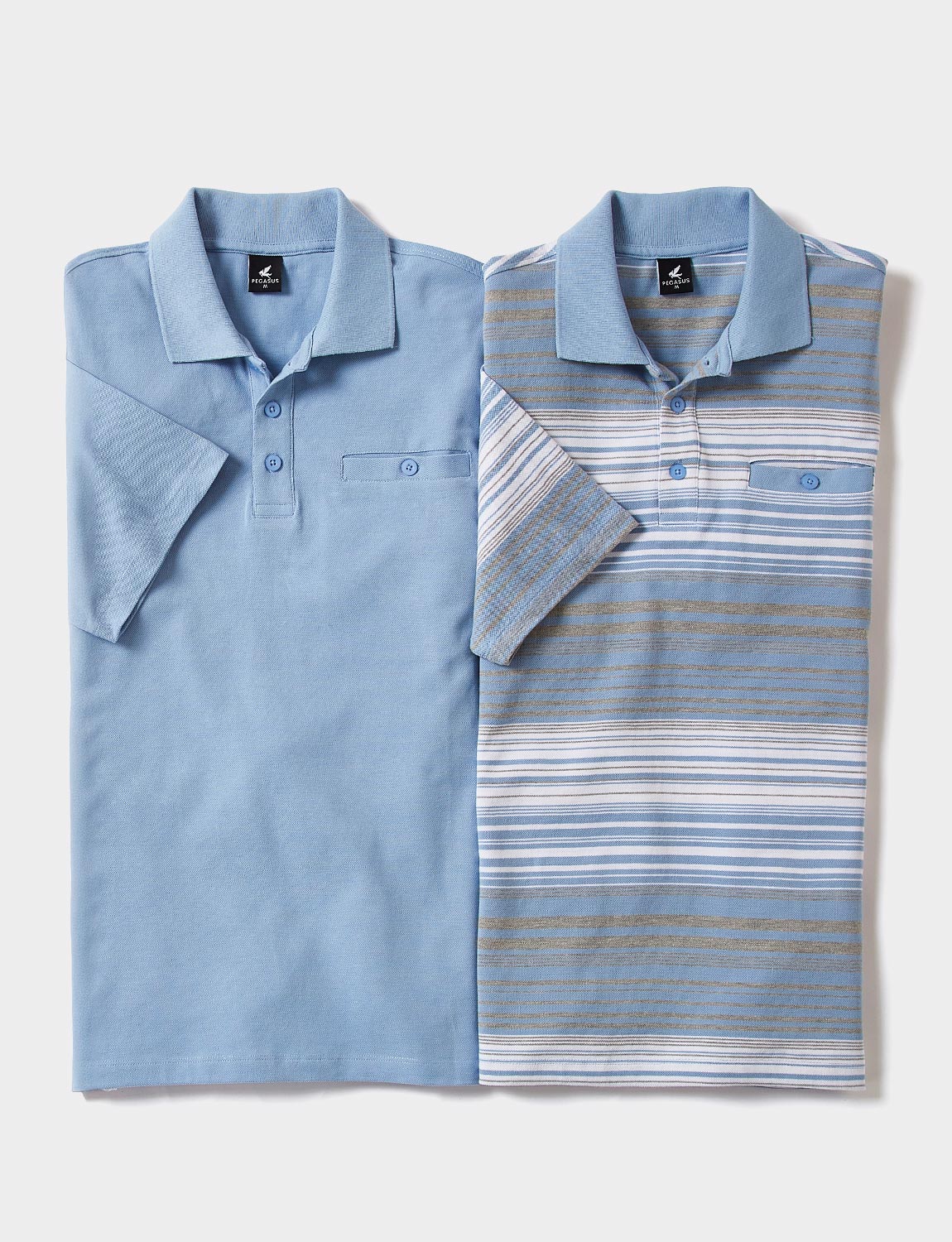 Great value soft cotton polos with 3 button placket and flat knit collar. 1 stripe polo with chest pocket and 1 plain polo per 2 pack. Approx length 29".