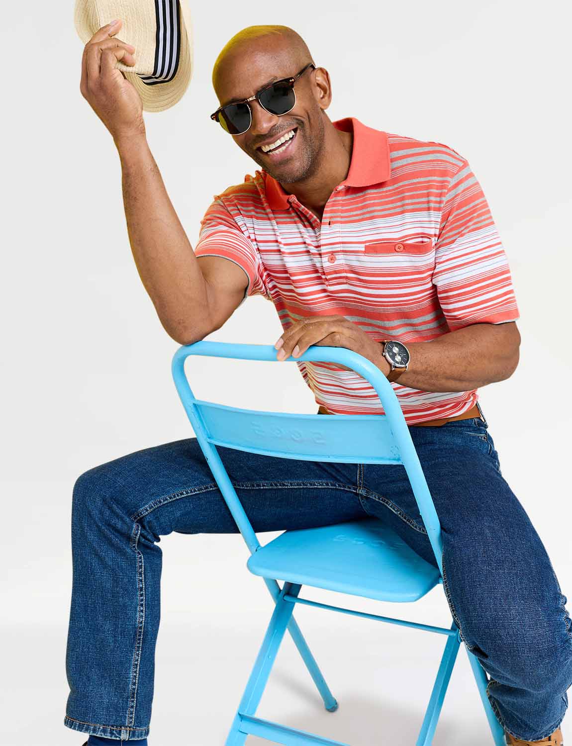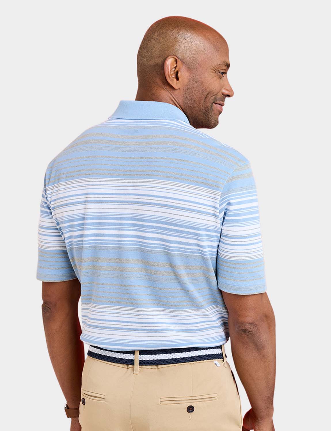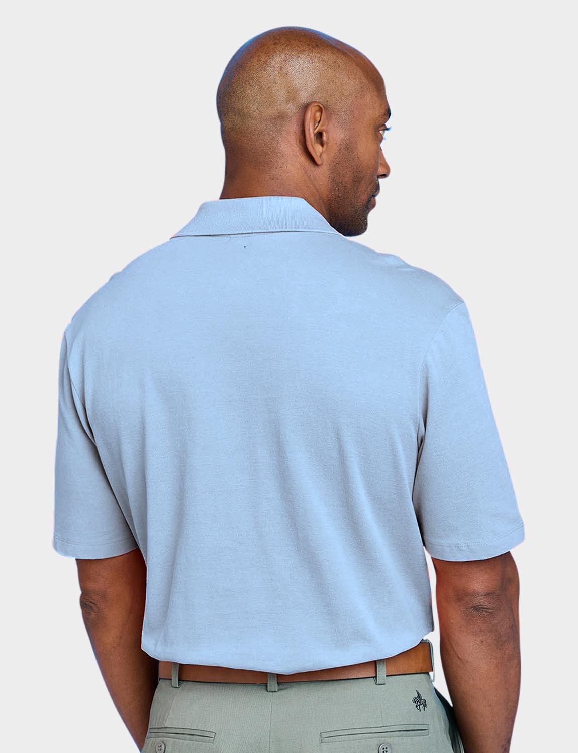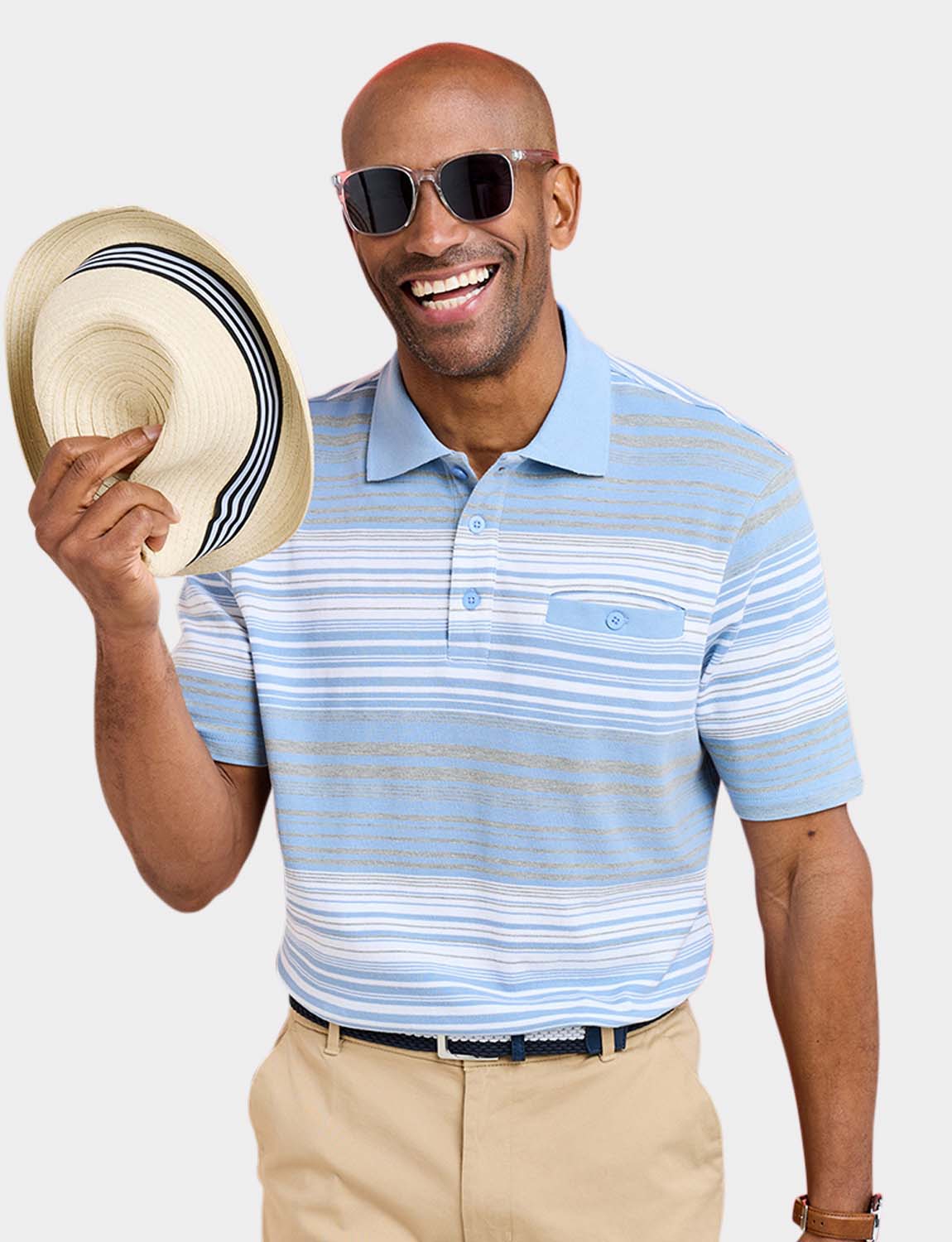 Great value soft cotton polos with 3 button placket and flat knit collar. 1 stripe polo with chest pocket and 1 plain polo per 2 pack. Approx length 29".