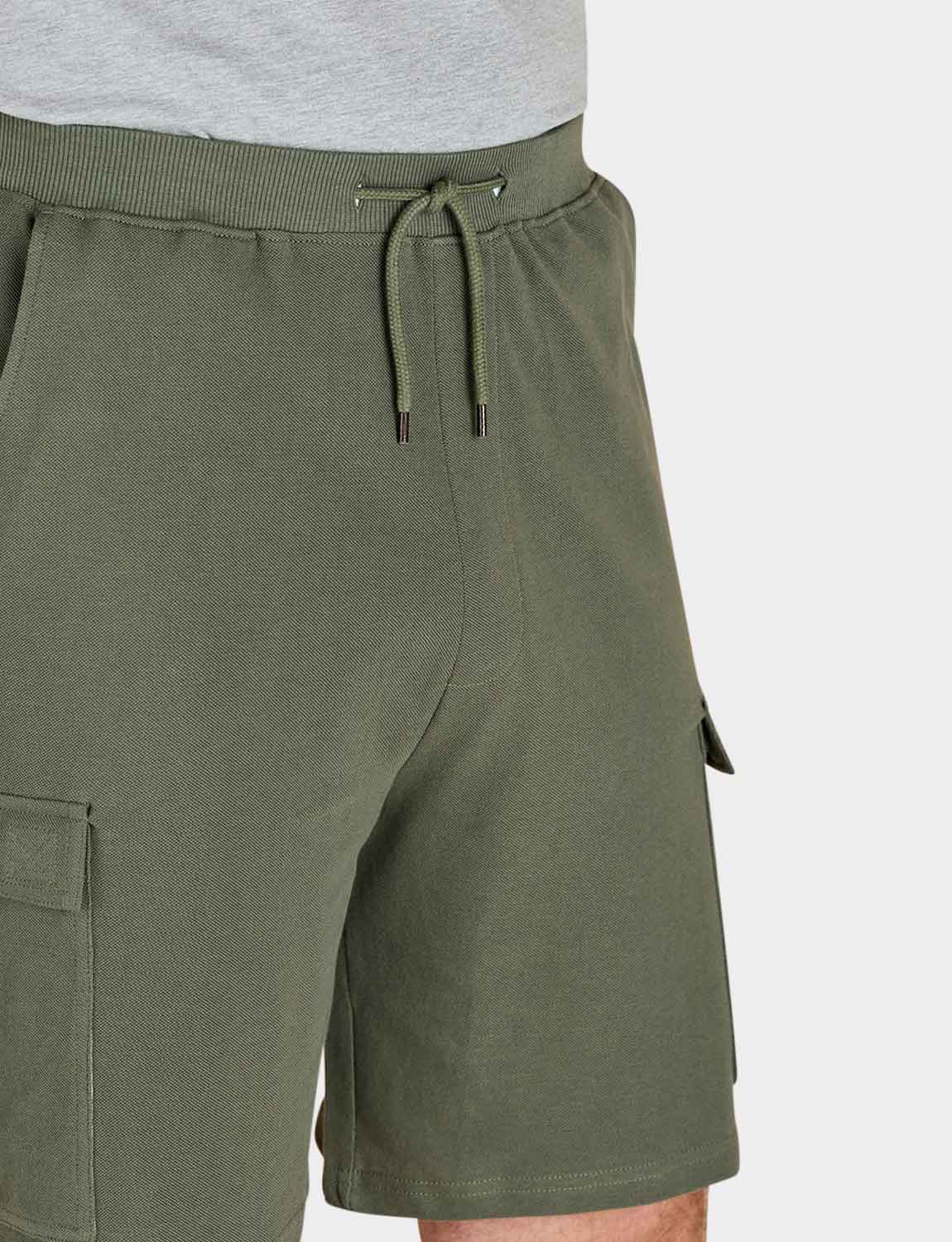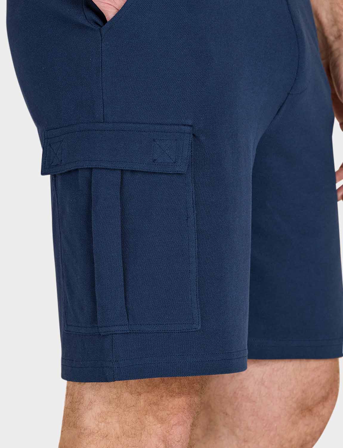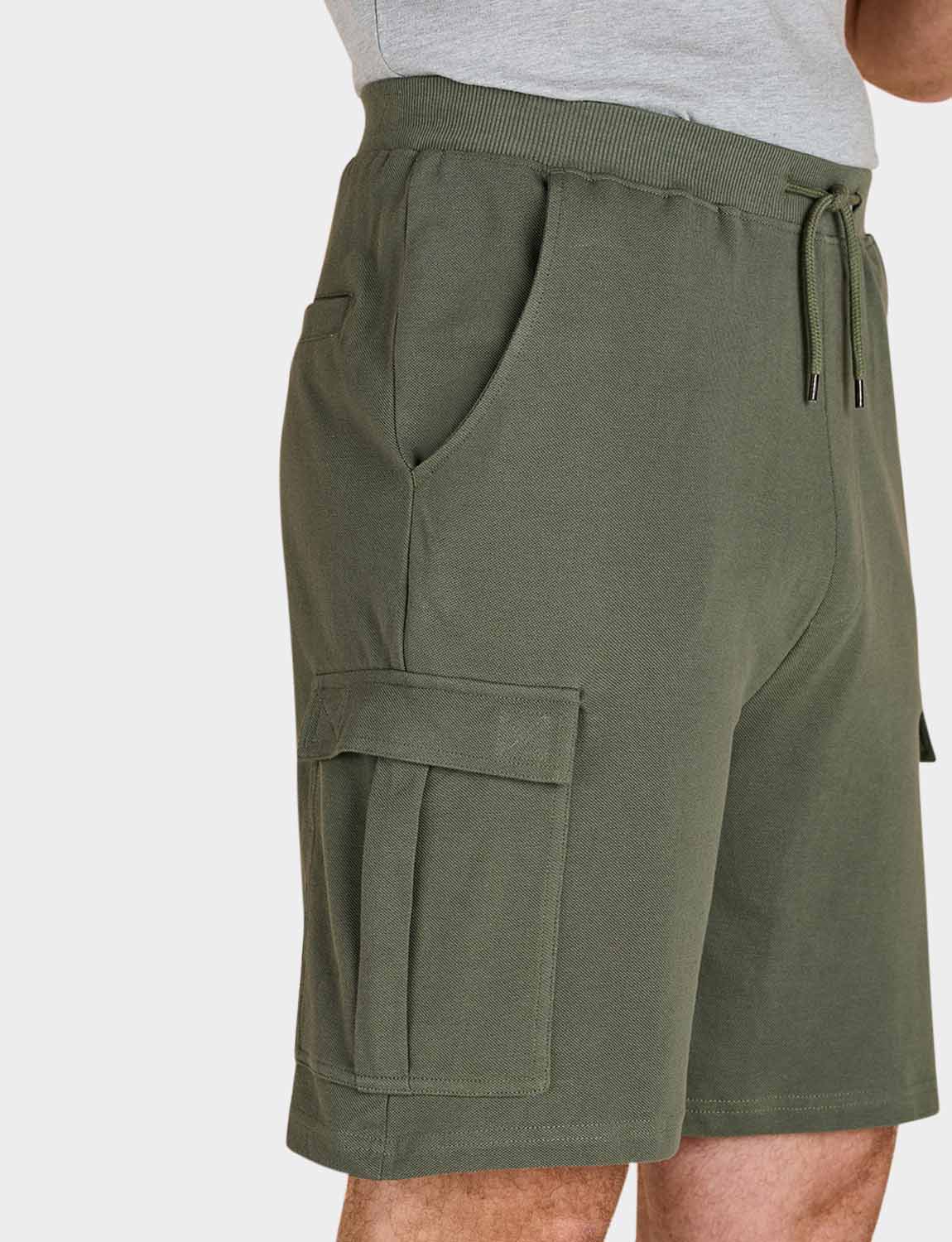 Fully elasticated pull on shorts in soft breathable pique cotton with 2 side pockets, adjustable drawcord waist and 2 large cargo pockets to the out leg. 2 Navy or 2 Khaki per 2 pack. Inside leg approx 8".