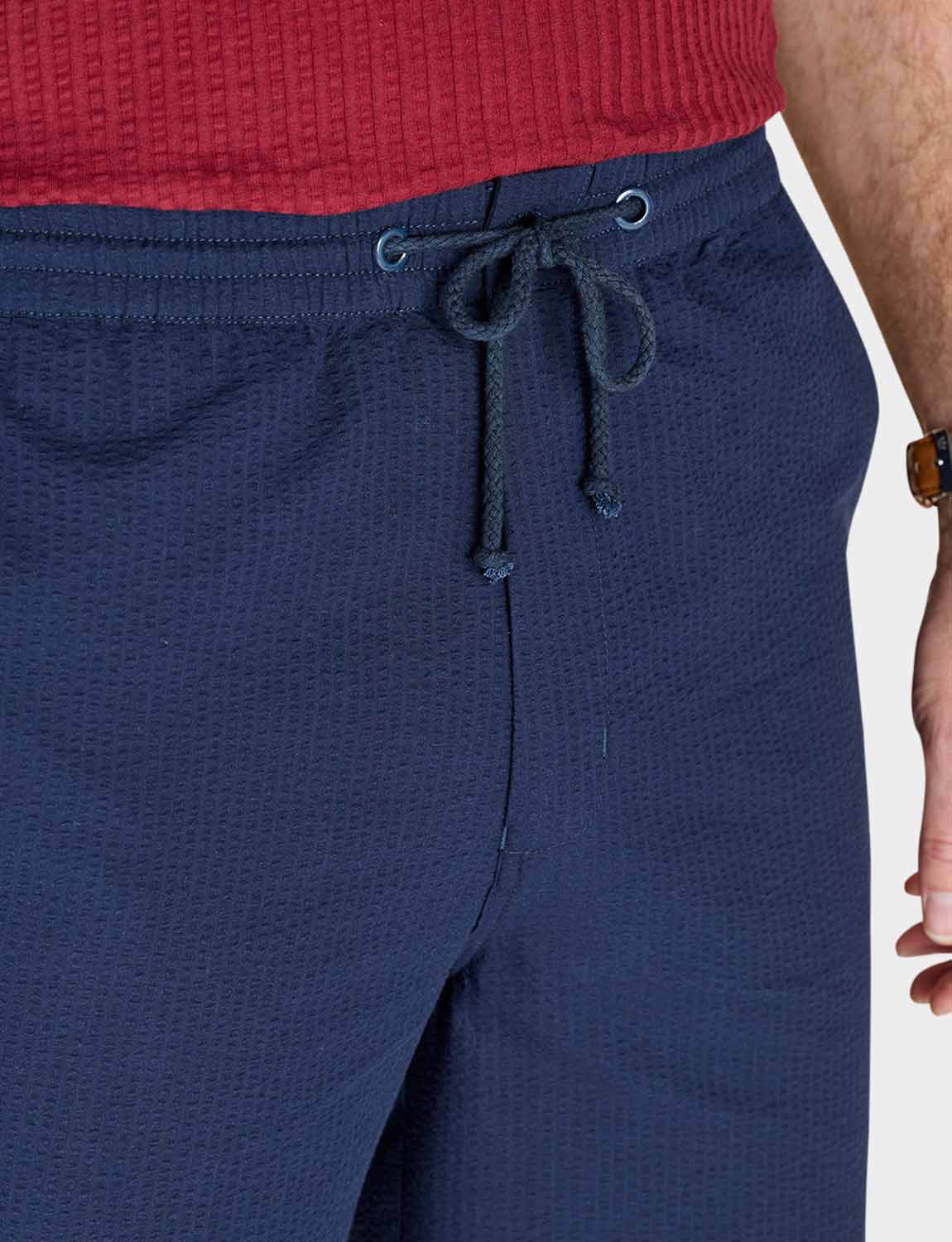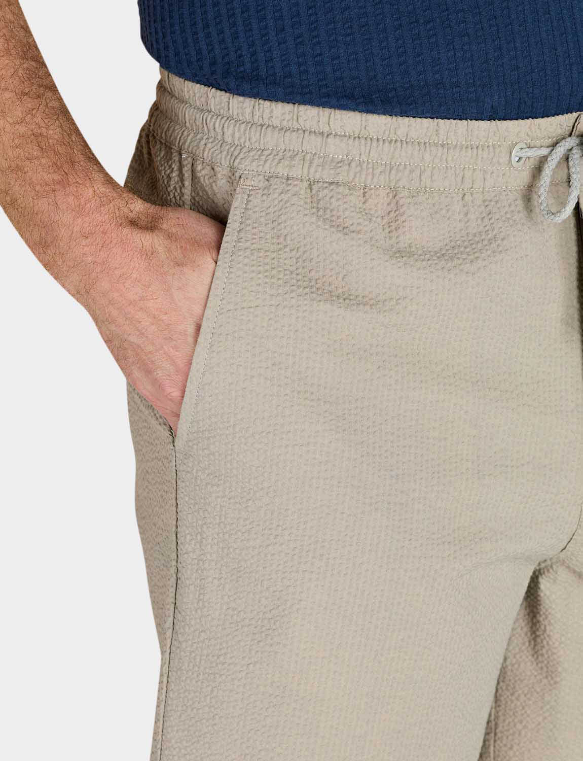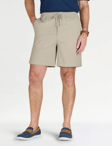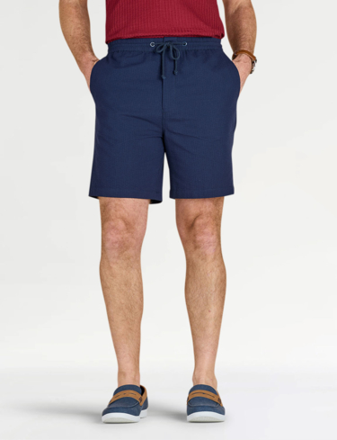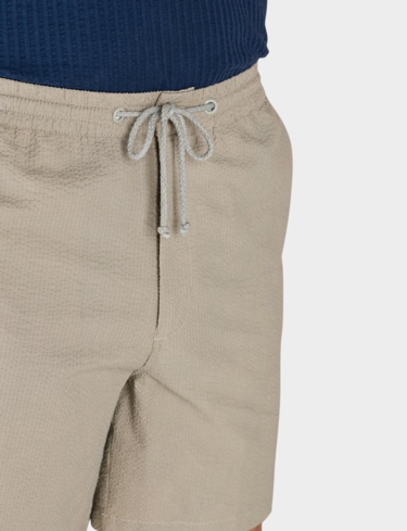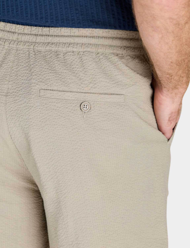 Lightweight short in easy care seersucker fabric. Fully elasticated stretch waistband with zip fly, button fastening and adjustable drawcord. 2 side pockets and 2 button fastening back pockets. Inside leg approx 7".